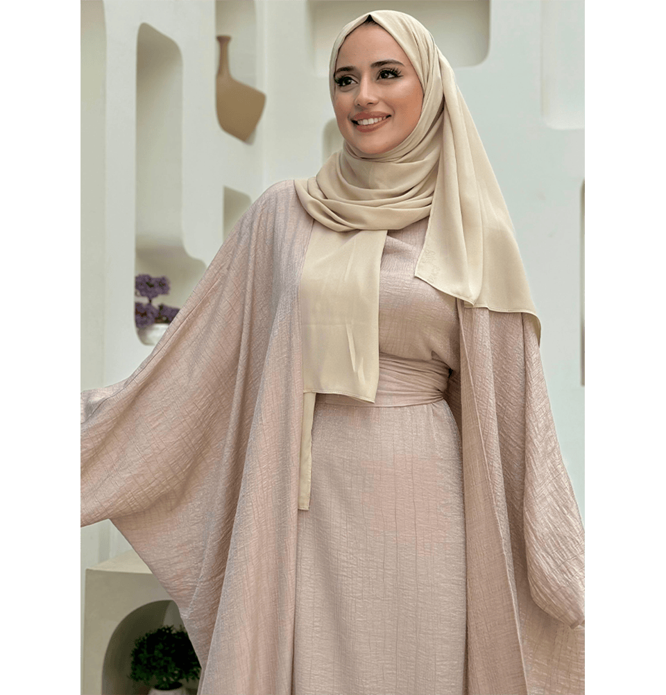 Modest Muslim Woman's Luxe Silk Kimono Two Piece Abaya - 8497 Stone Beige
