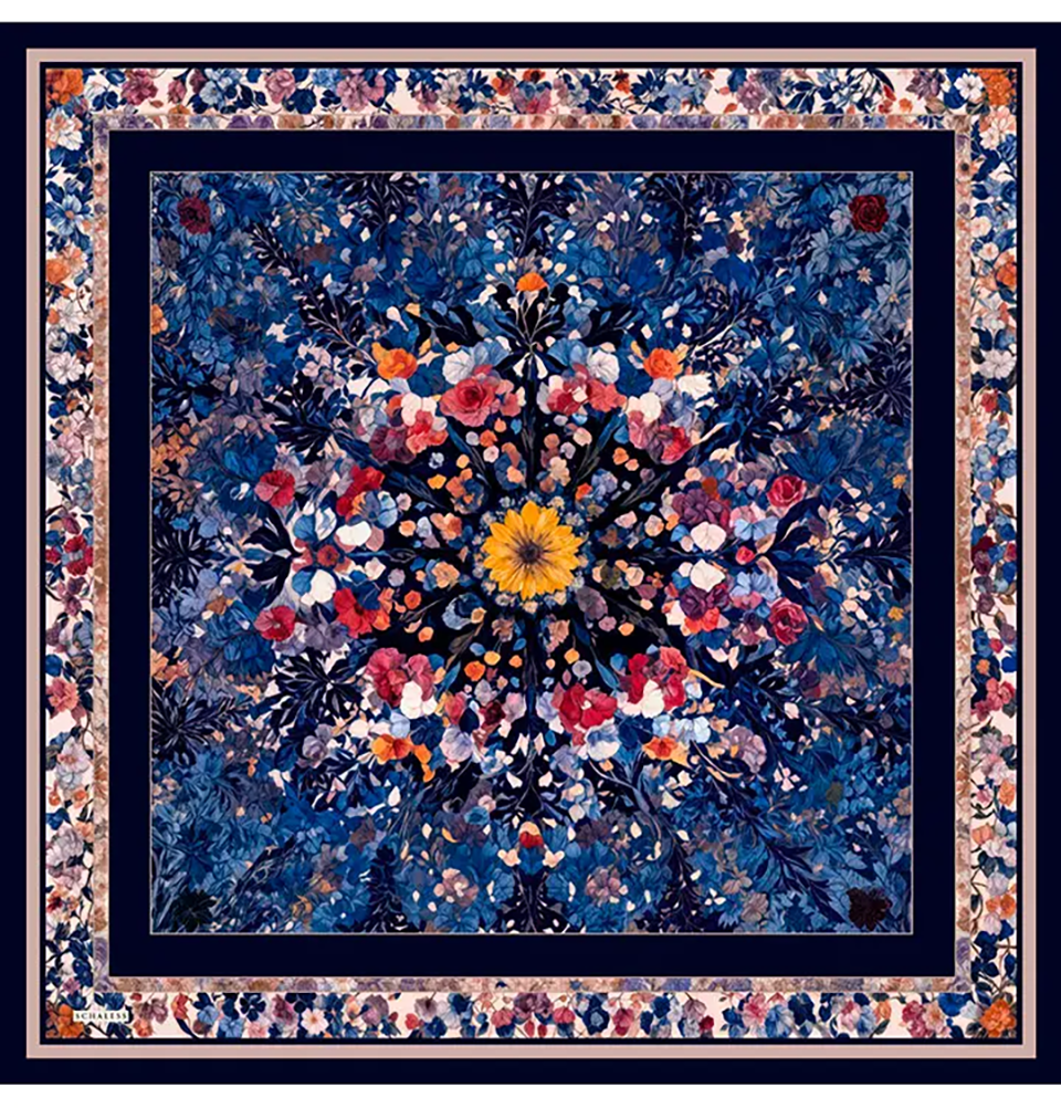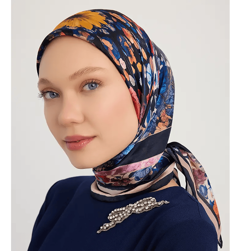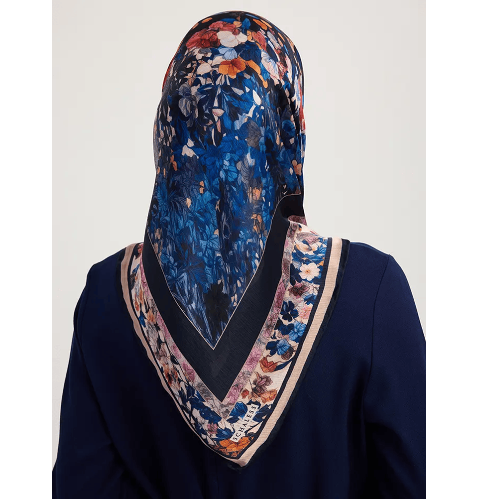 Aurora Satin Square Hijab Cosmic Flowers - Navy Blue