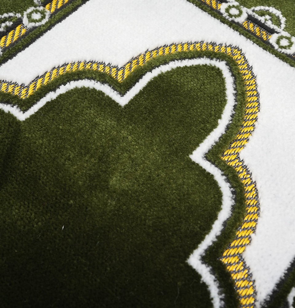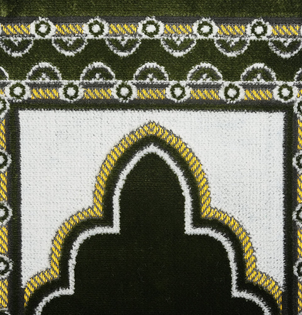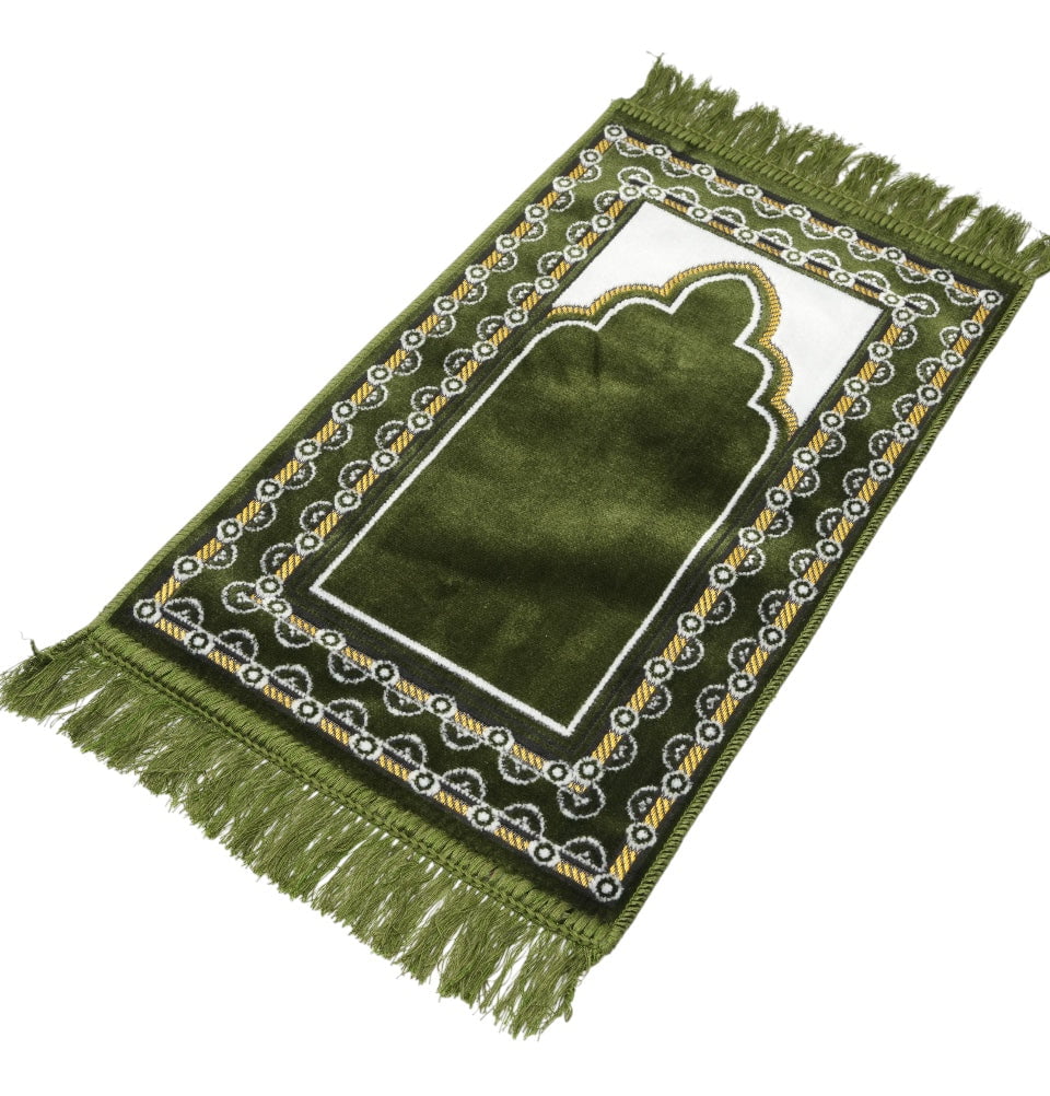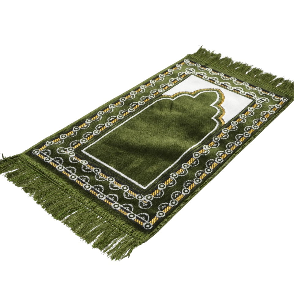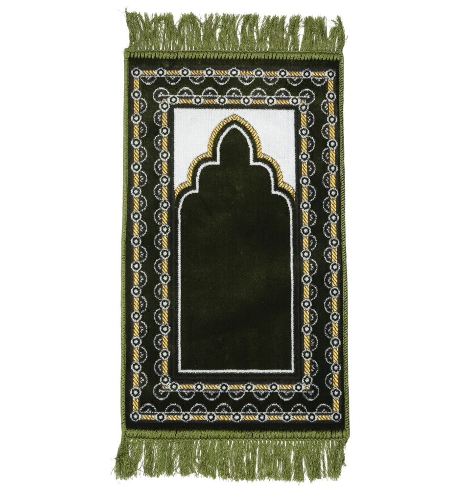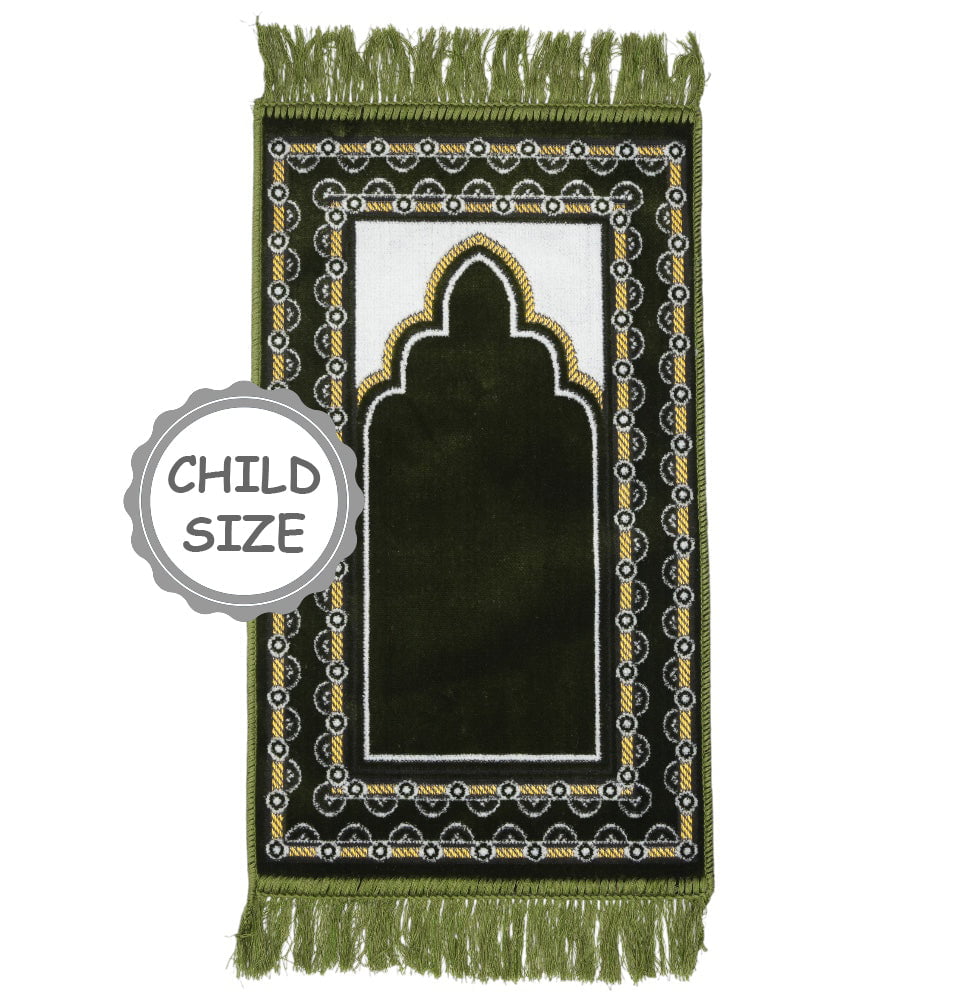 Child Velvet Islamic Prayer Rug - Dotted Border Olive Green