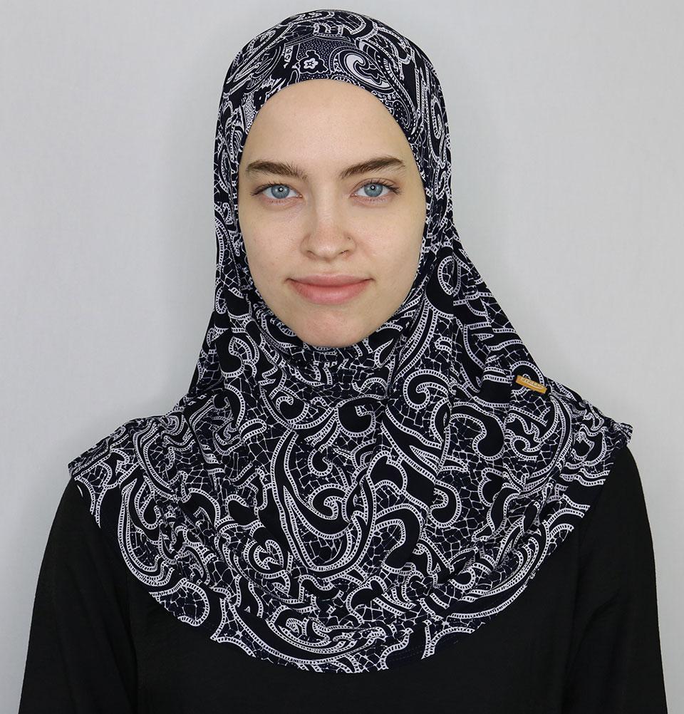 Modefa makes modest fashion easy with the Firdevs Practical Hijab! Featured here is a gorgeous mosaic design in midnight blue!