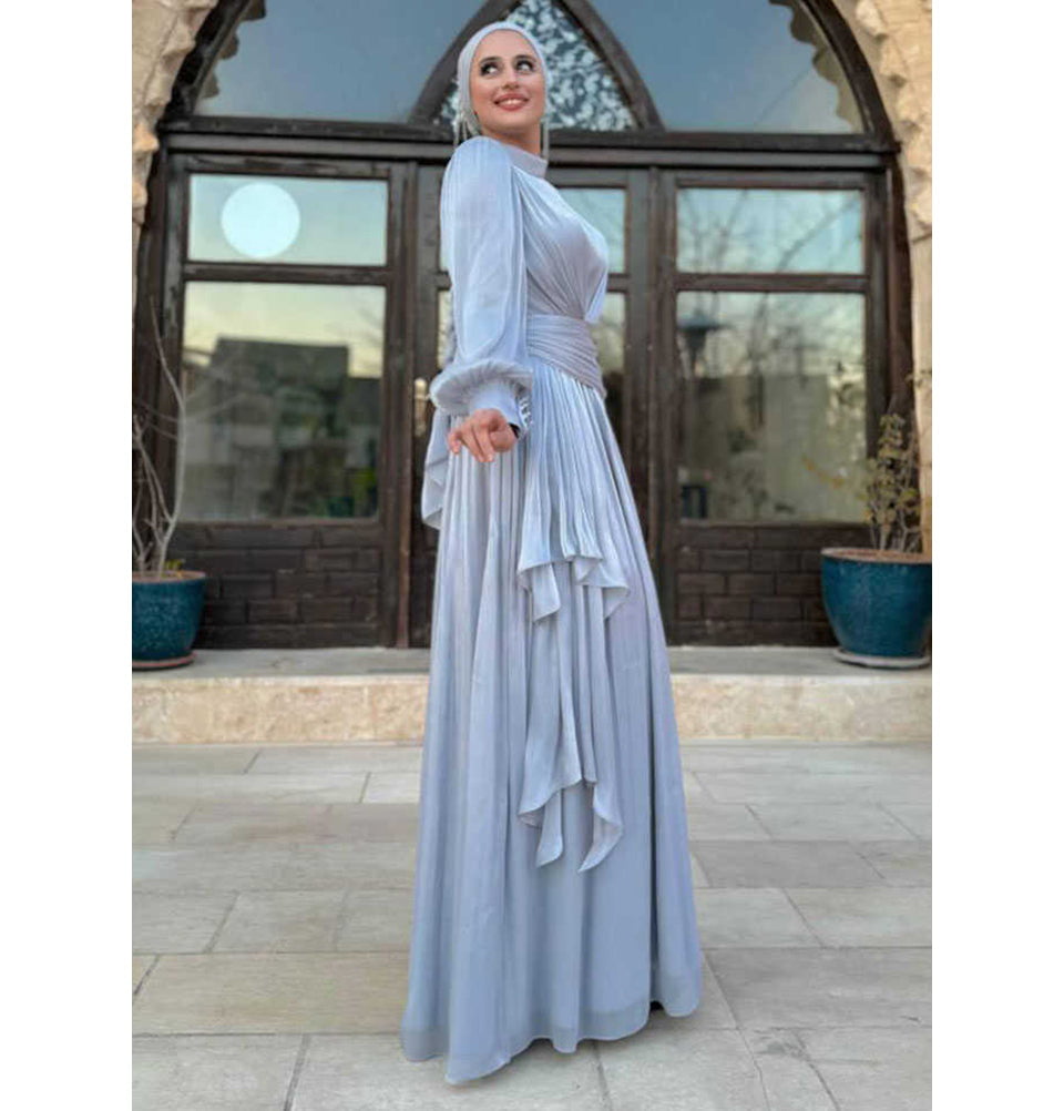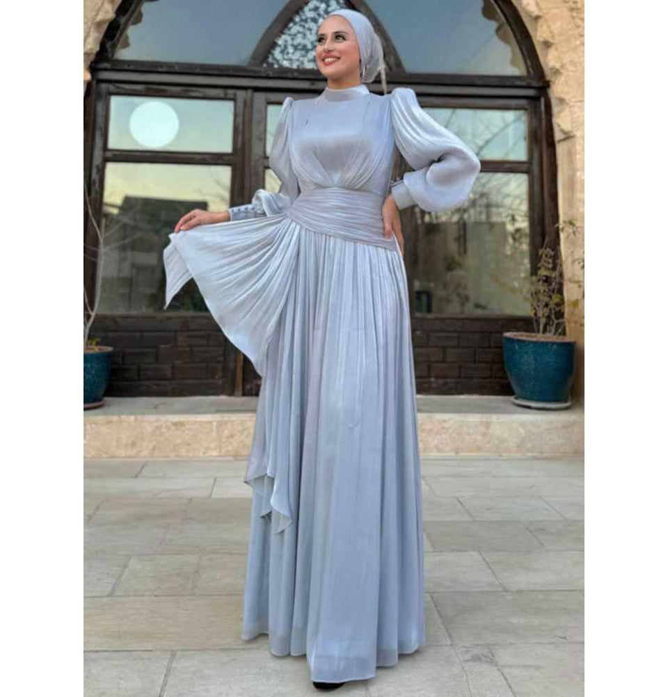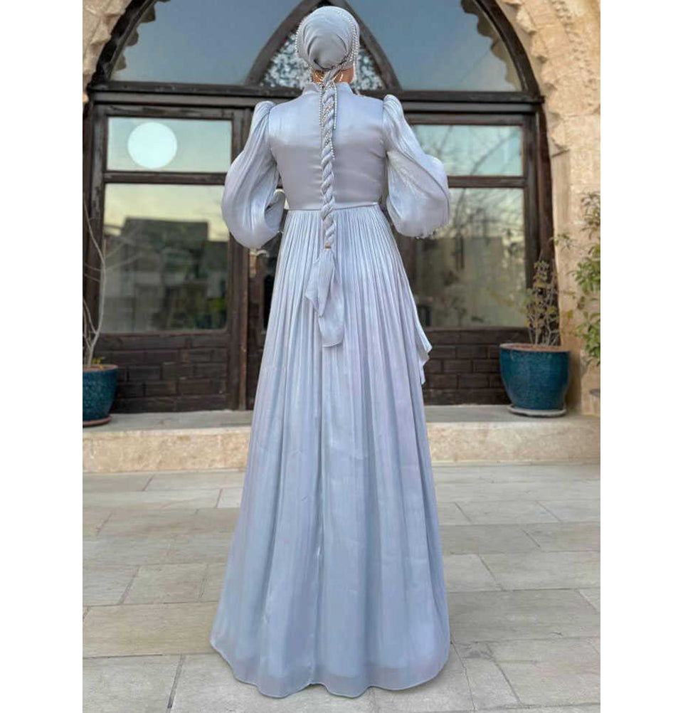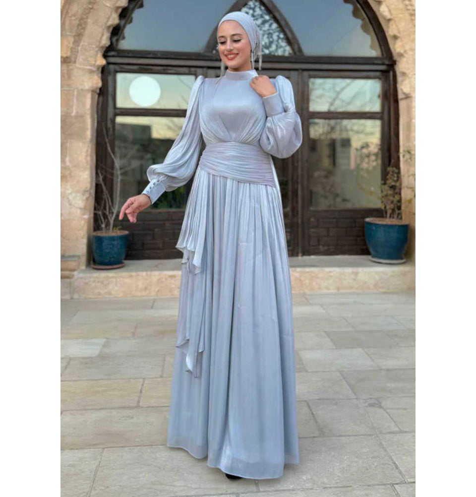 Make an unforgettable entrance with this elegant pleated evening gown, designed with a refined modest silhouette and luxurious flowing fabric. The dress features beautifully structured puff sleeves, a high neckline, and a wide, ruched waistband that accentuates the figure while maintaining full coverage. Soft, cascading pleats throughout the skirt create graceful movement, while the asymmetrical draped detail adds a touch of high-fashion sophistication. Perfect for weddings, formal events, engagements, or special occasions, this gown blends modesty with modern elegance.