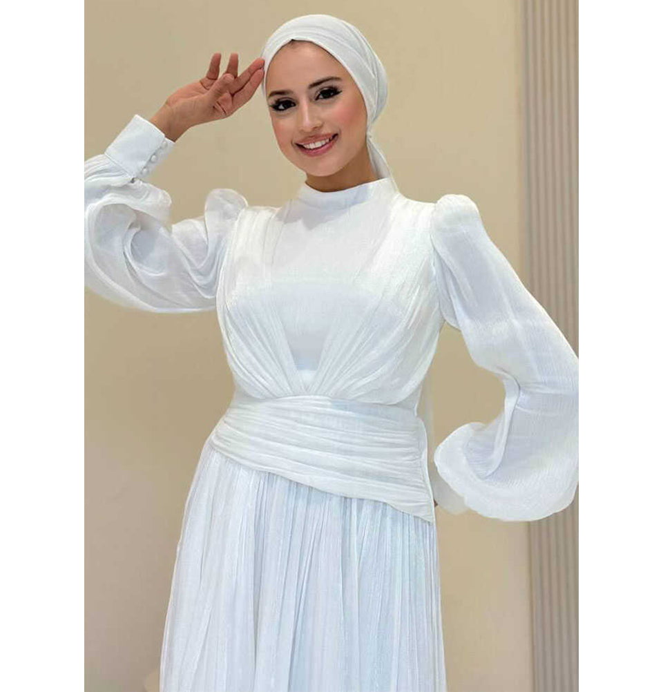 Make an unforgettable entrance with this elegant pleated evening gown, designed with a refined modest silhouette and luxurious flowing fabric. The dress features beautifully structured puff sleeves, a high neckline, and a wide, ruched waistband that accentuates the figure while maintaining full coverage. Soft, cascading pleats throughout the skirt create graceful movement, while the asymmetrical draped detail adds a touch of high-fashion sophistication. Perfect for weddings, formal events, engagements, or special occasions, this gown blends modesty with modern elegance.