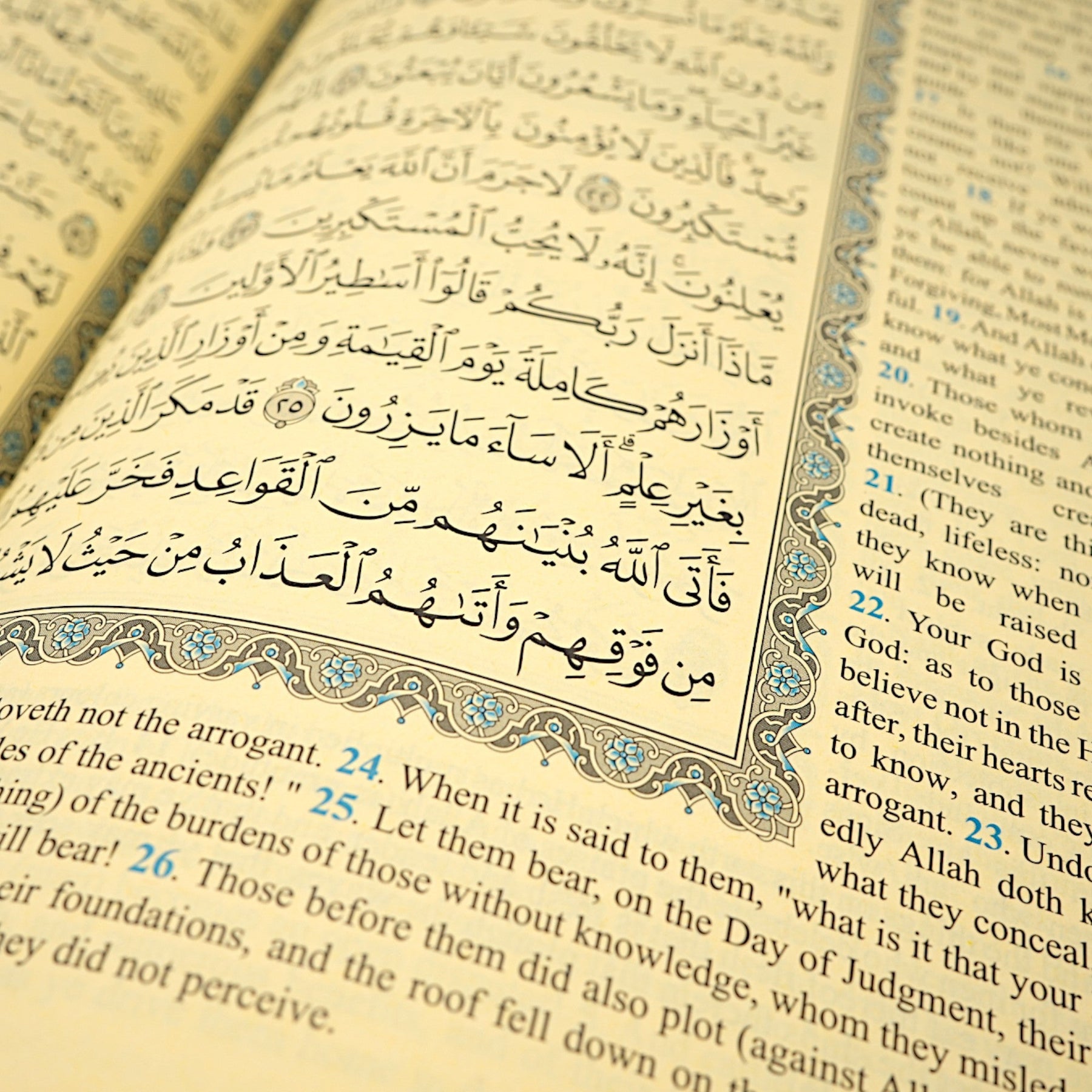 - Quran with Arabic script and English translation. Detailed pages with built-in ribbon bookmark and a scannable QR code on each page to listen to the recitation.