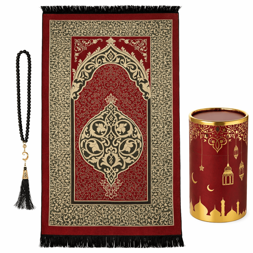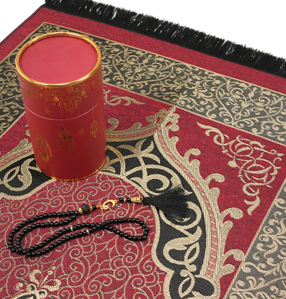 Ramadan Lantern Cylinder Gift Box Set with Prayer Mat & Prayer Beads - Red