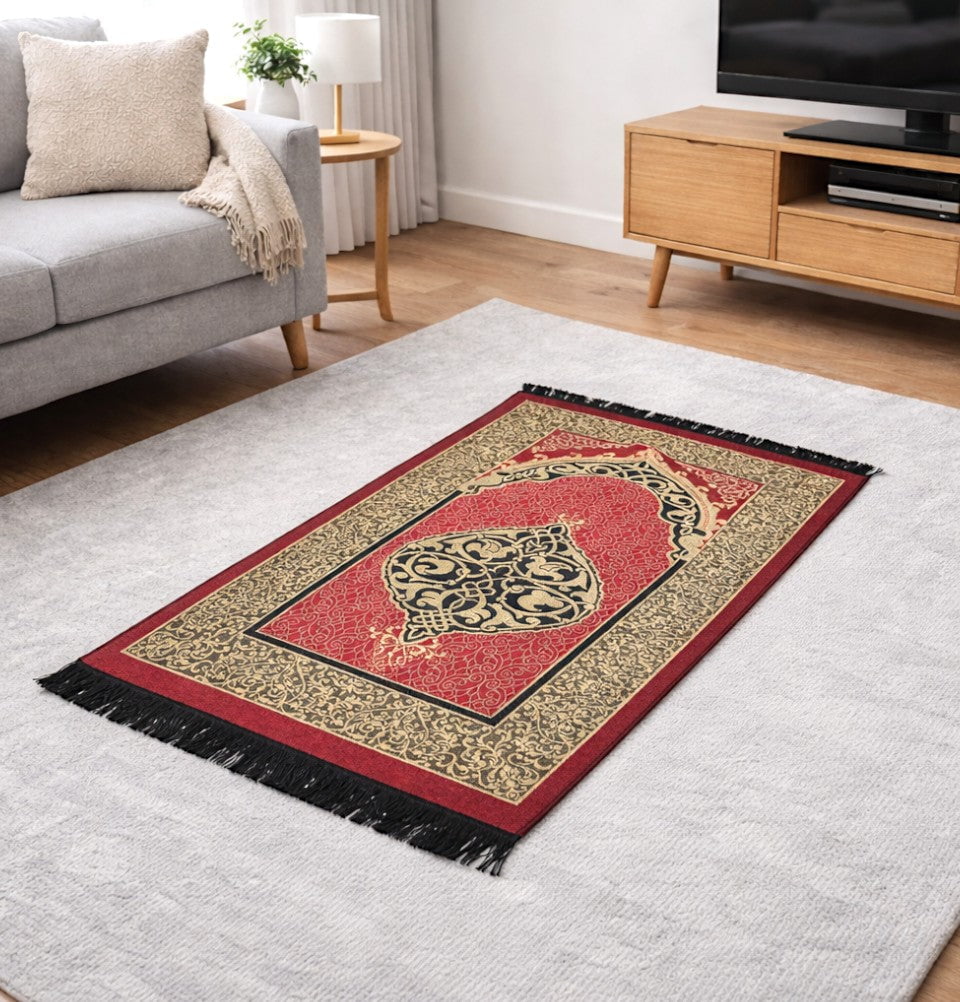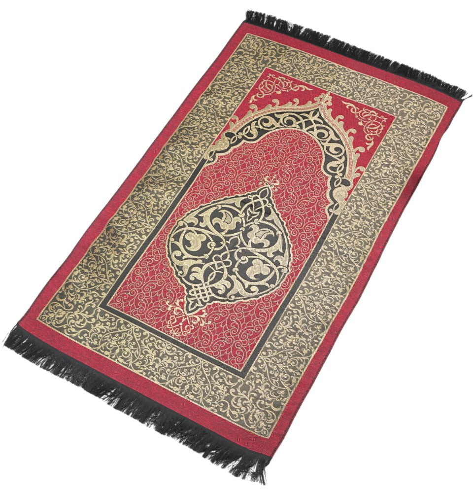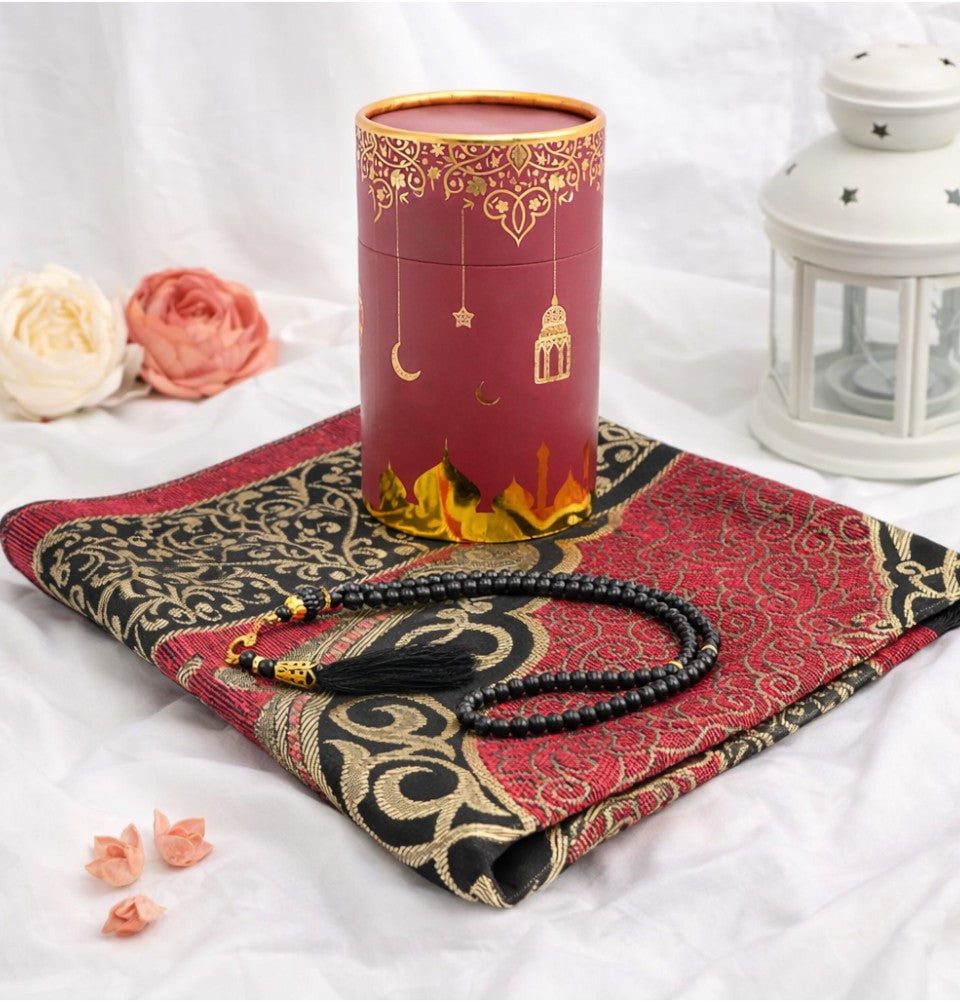 A beautiful Muslim gift set that comes with misbaha beads and an Ottoman print prayer rug, all stored in a cylinder packaging designed with gold printed lanterns and a silhouette of a masjid! Great gift set for Ramadan, Eid, and other special occasions.