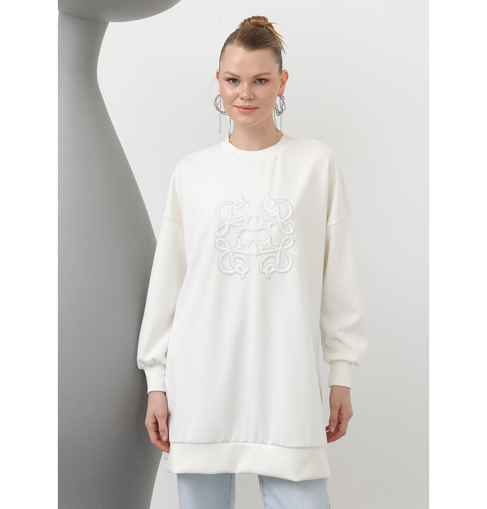This refined tunic brings subtle elegance to everyday modest wear with its delicate rhinestone embellishment. Designed in a relaxed silhouette, it offers comfortable coverage while maintaining a polished and contemporary look.