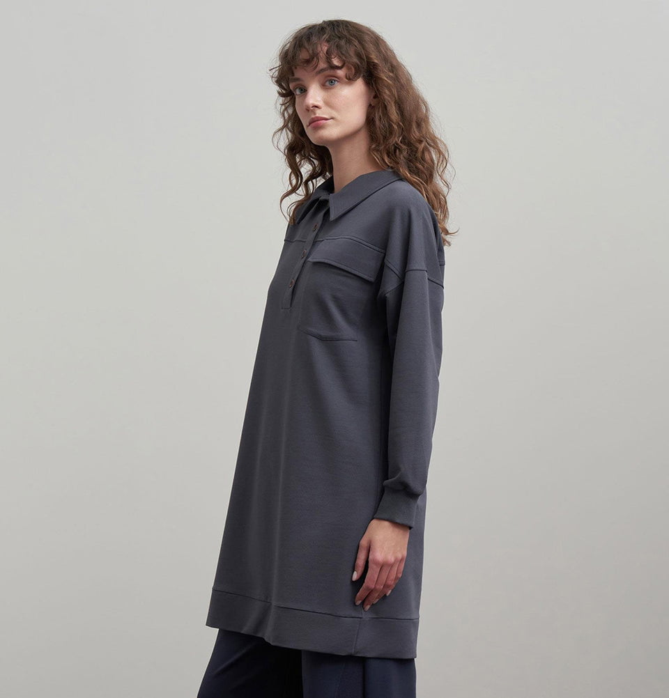 Refresh your casual wardrobe with this Cotton blend Tunic — a perfect fusion of comfort and understated contemporary style. Designed in a soft cotton-blend knit with relaxed, dropping shoulders and a laid-back silhouette, this tunic elevates everyday outfits with its minimalist charm. The classic shirt collar and subtle pocket detailing bring a refined edge to versatile modest layering looks.
