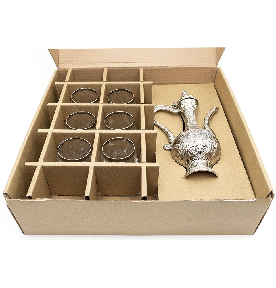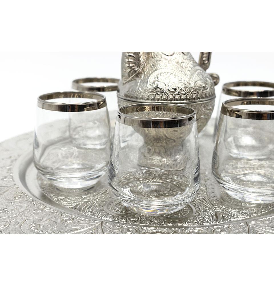 Turkish Luxury 8 Piece Zamzam Water Cup Set | Ottoman Style Tray with Pitcher - 317-K-11 Silver