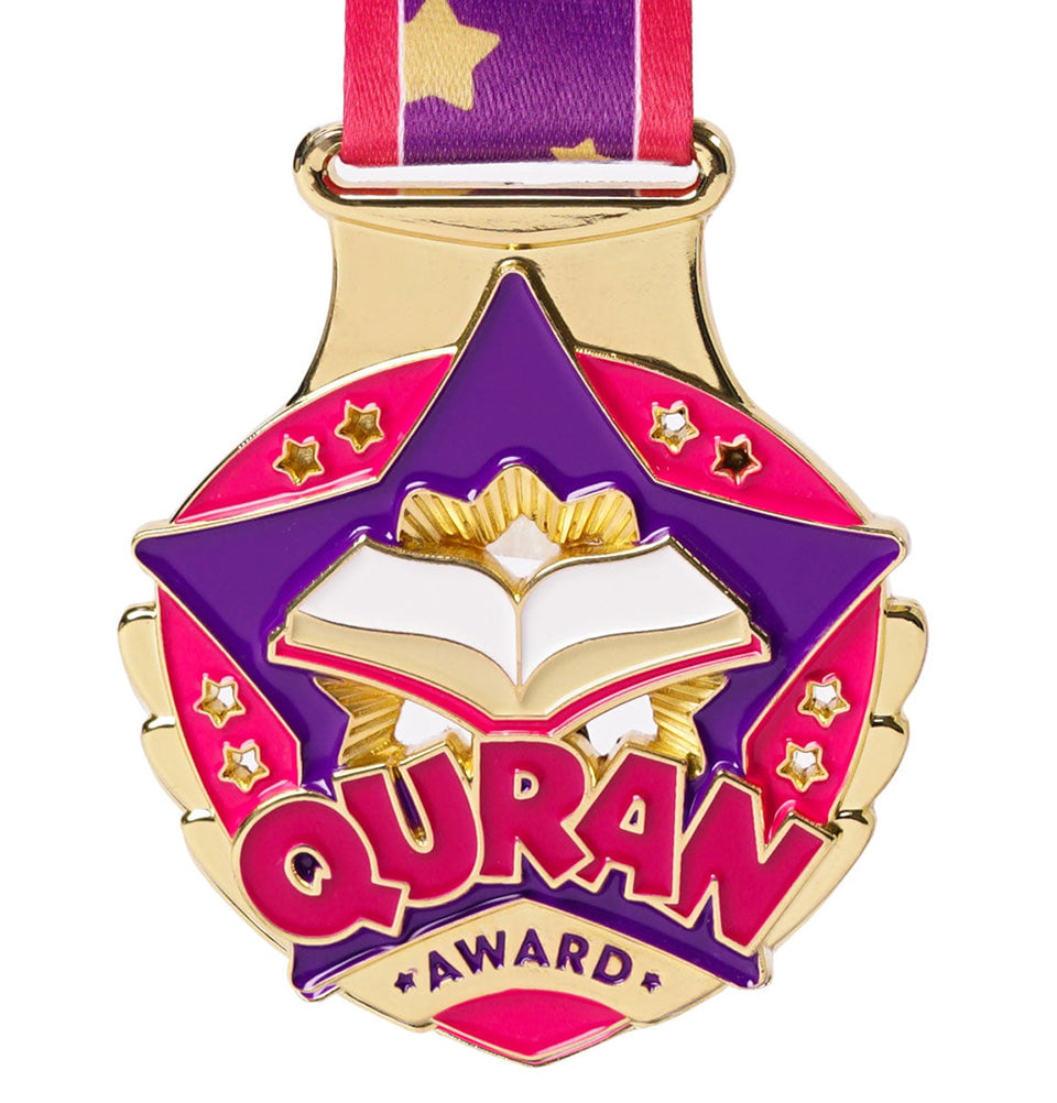 The Quran Medal is a commemorative award designed to celebrate Quran achievements, such as completing the recitation of the Quran, memorizing a surah or juz, or finishing hifdh. It is meant to recognize and honor these important spiritual milestones. It is typically given to children, students, or Quran learners during ceremonies, graduations, or celebrations in Islamic schools and communities. Great way to motivate the kids on their Quran learning journey.