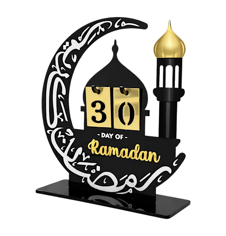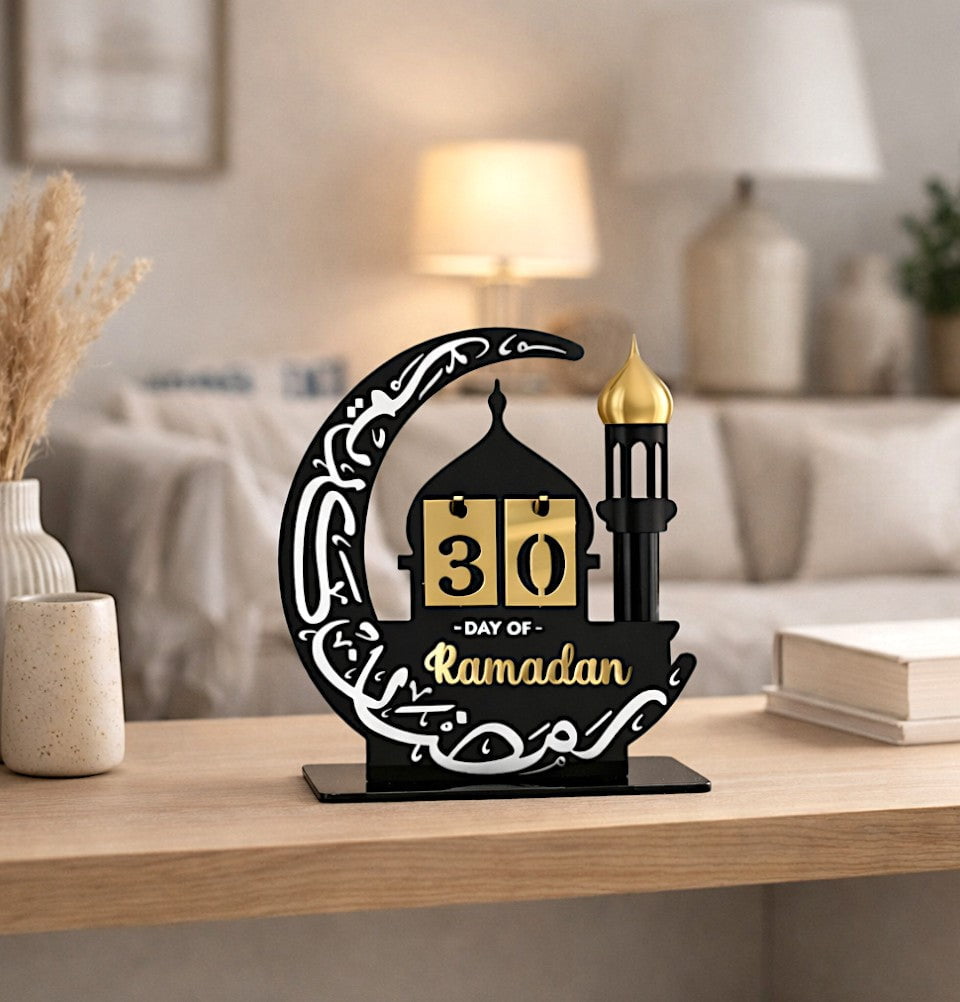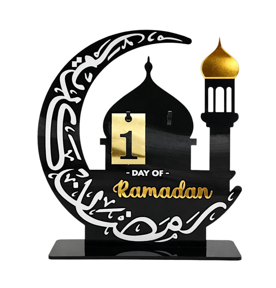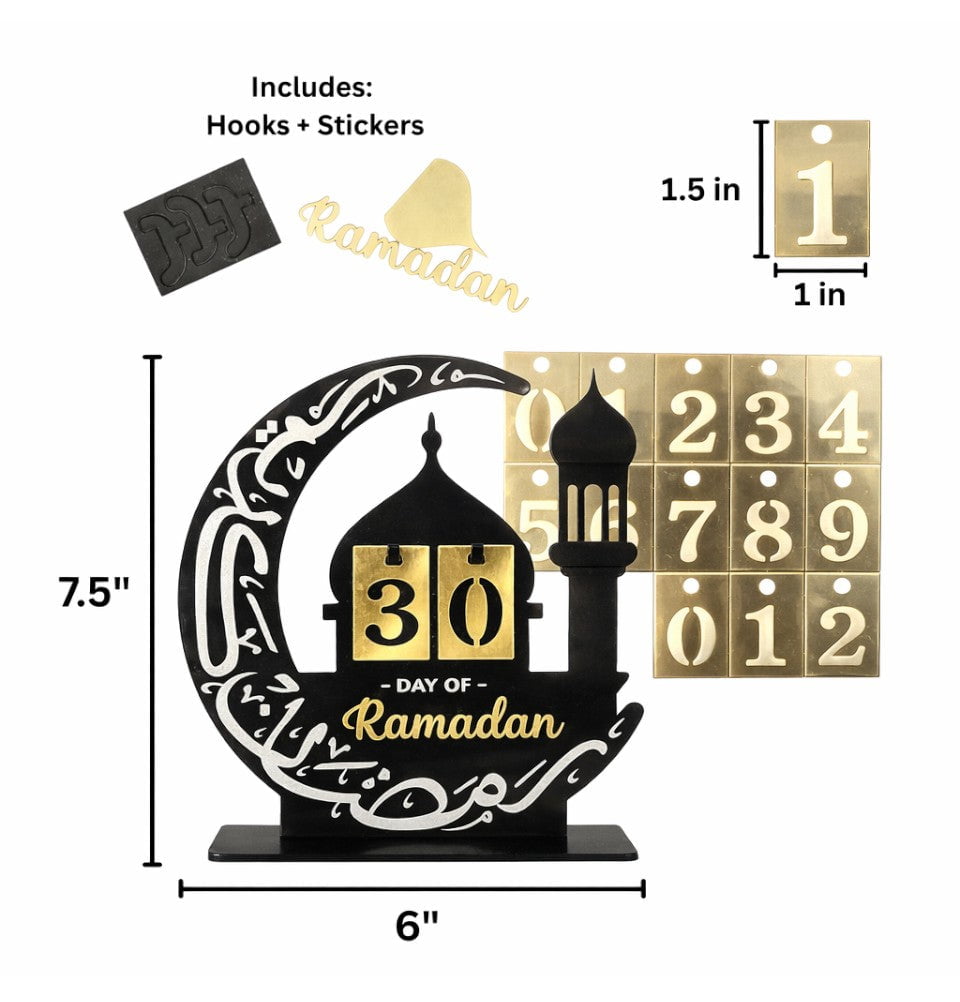 Welcome the blessed month Ramadan with this simple yet sleek Crescent Moon Calendar. This beautifully crafted "Day of Ramadan" Crescent Moon silhouette countdown sign to keep you intentional and aware of how many days of the month is left. It blends seamlessly into any home décor while creating a meaningful display for individuals and families alike. Perfect for shelves, mantels, or prayer spaces, this piece adds warmth and remembrance to be intentional throughout the holy month.