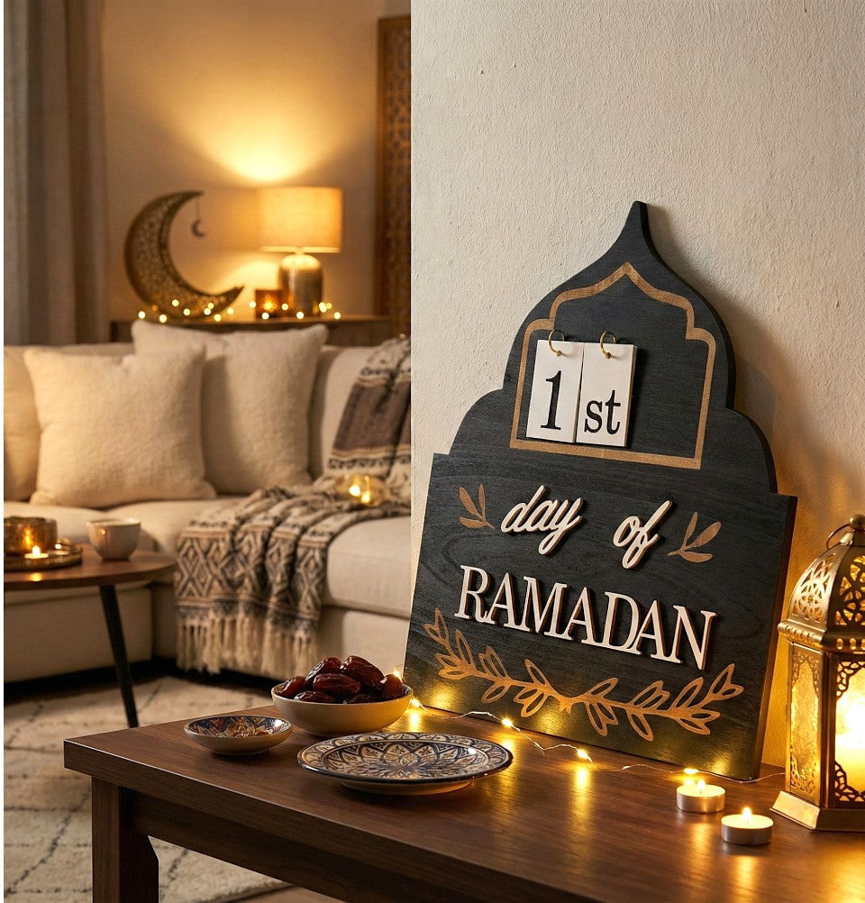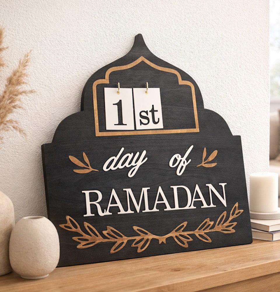 Celebrate the blessed month with timeless elegance. This beautifully crafted "Day of Ramadan" wooden countdown sign is designed to mark each day of Ramadan with intention and reflection. Featuring a mihrab-inspired silhouette, neutral tones, and removable number tiles, it blends seamlessly into any home décor while creating a meaningful display for individuals and families alike. Perfect for shelves, mantels, or prayer spaces, this piece adds warmth and remembrance to be intentional throughout the holy month.