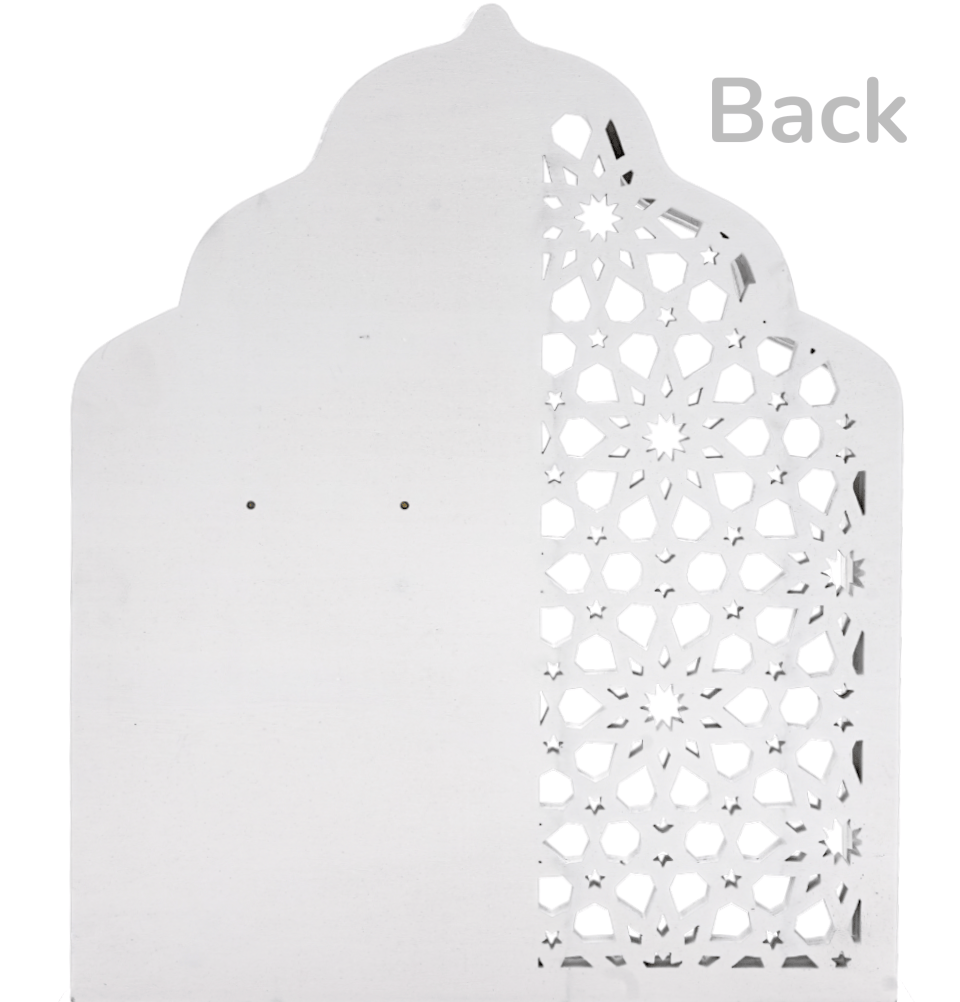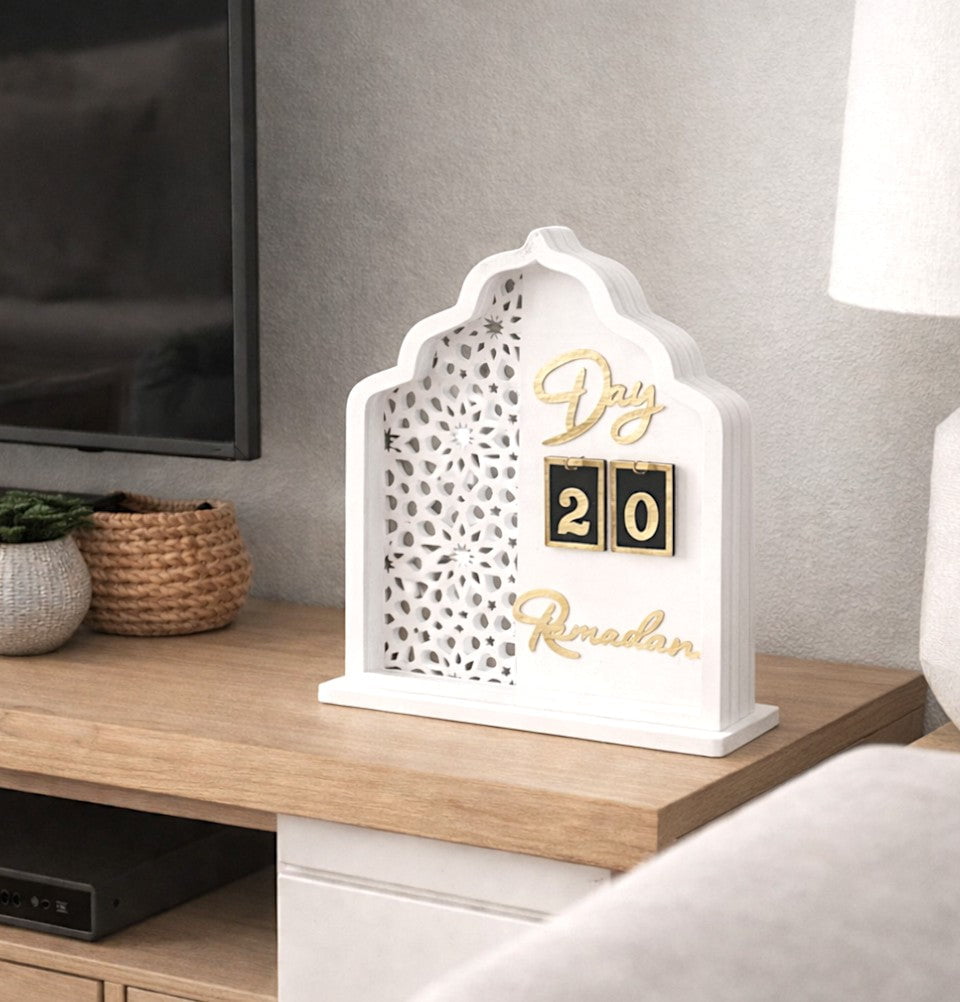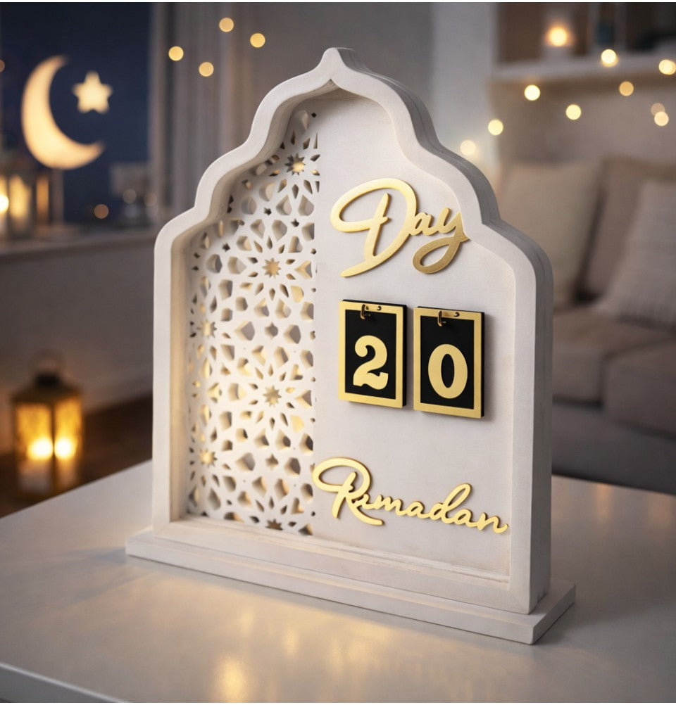 Celebrate the blessed month with timeless elegance. This beautifully crafted wooden calendar is designed to mark each day of Ramadan with intention and reflection. Featuring a mihrab-inspired silhouette, with a selcuk star pattern, with gold acrylic lettering and removable number tiles, it blends seamlessly into any home décor while creating a meaningful display for individuals and families alike. Perfect for shelves, mantels, or prayer spaces, this piece adds warmth and remembrance to be intentional throughout the holy month.