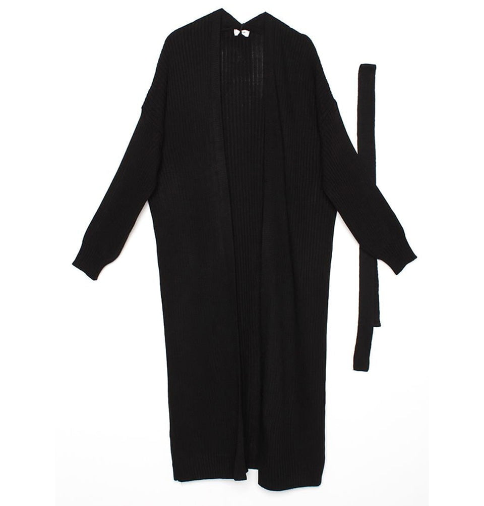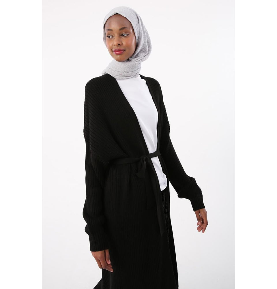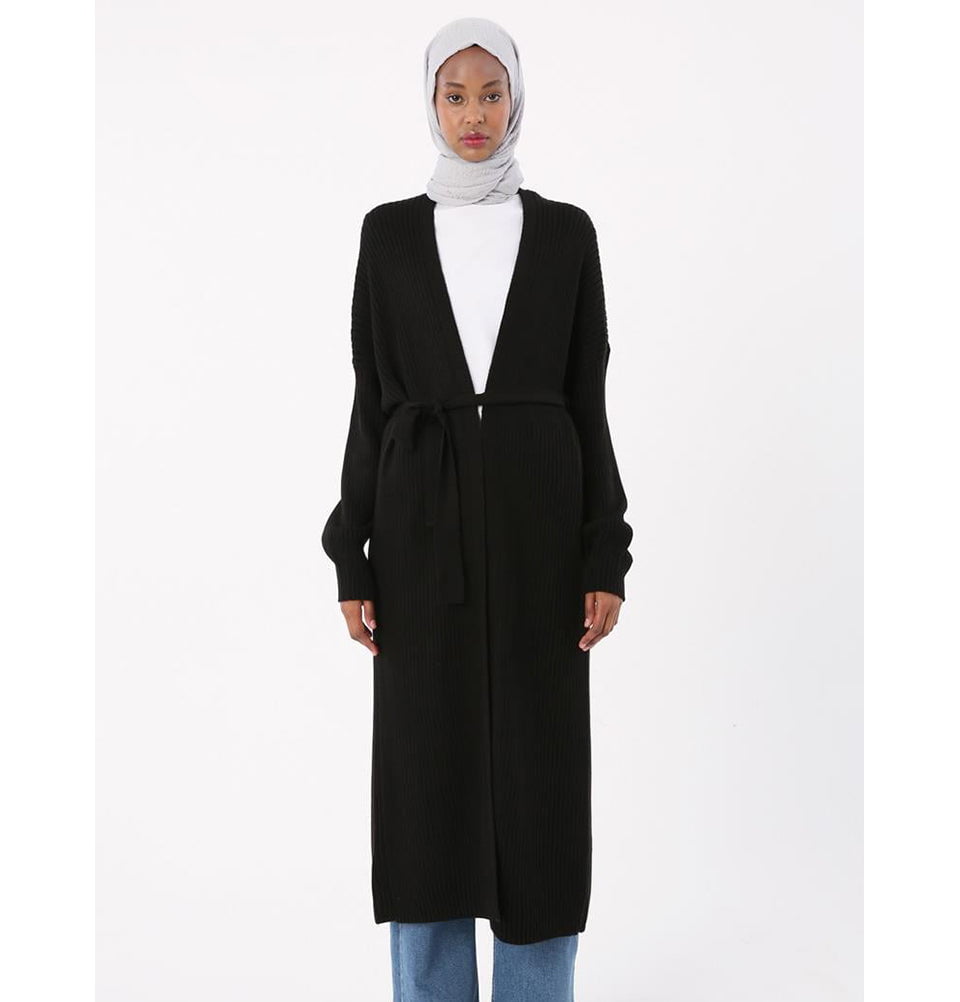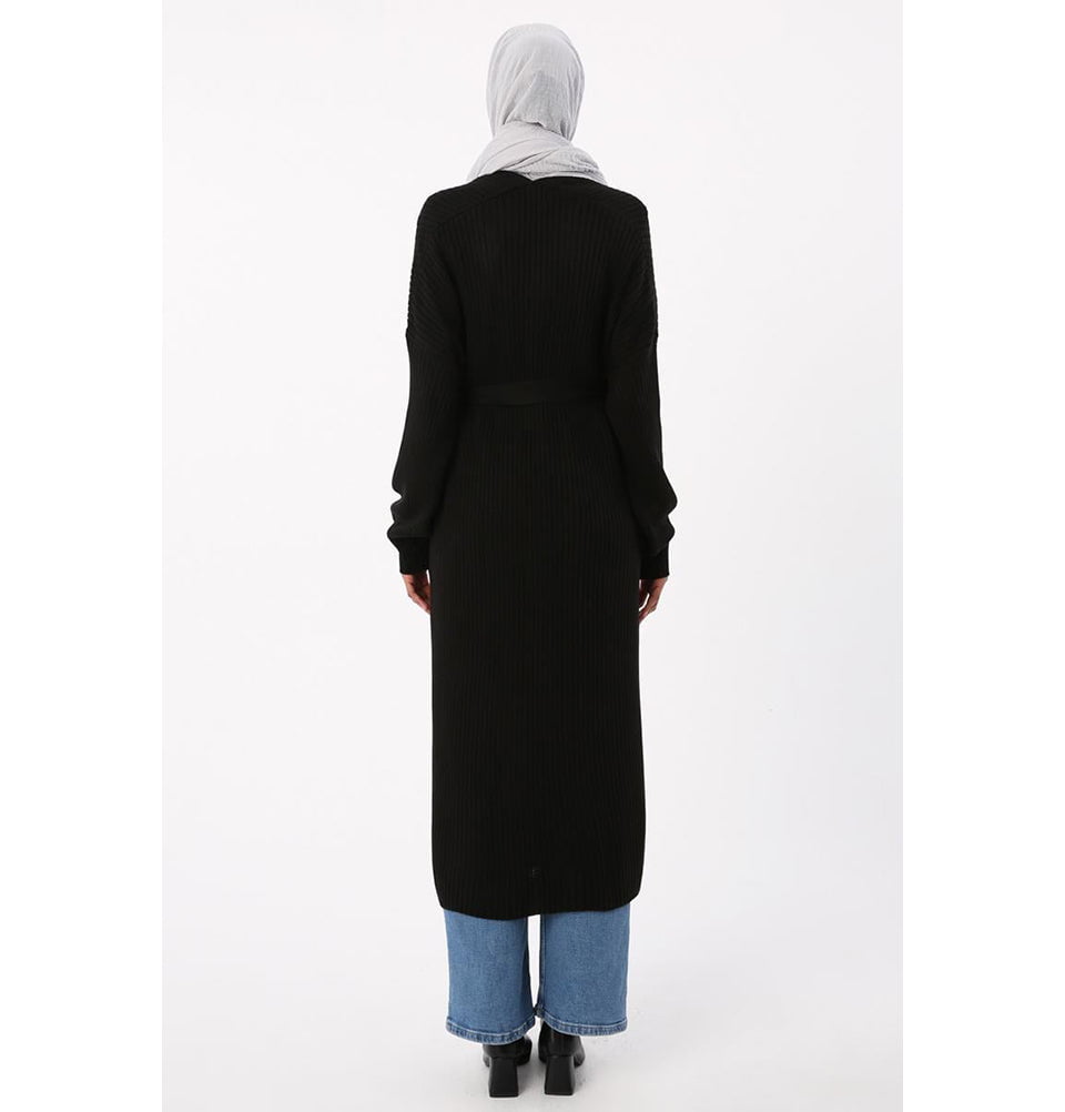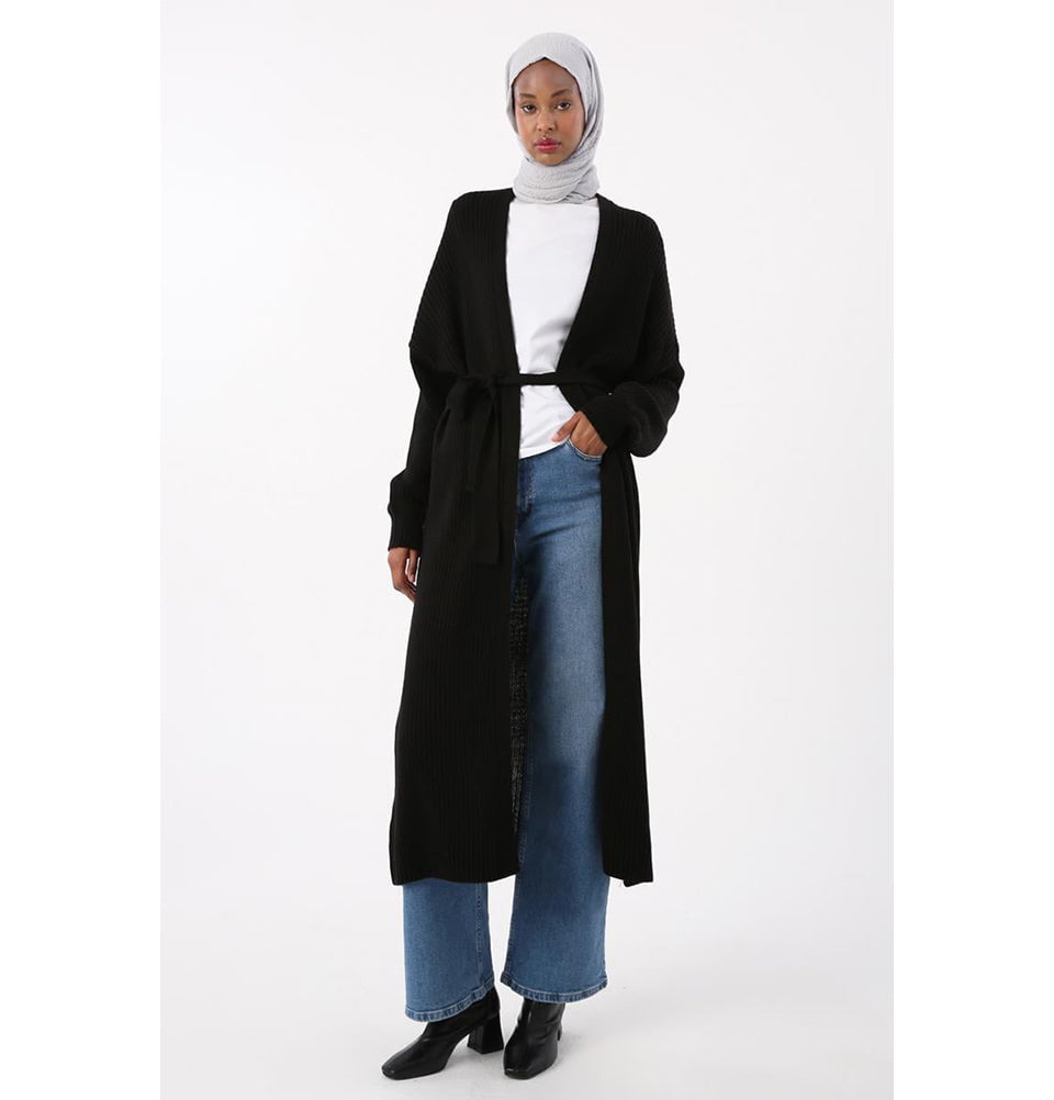 Modern Muslim Women's Belted Long Knitted Cardigan - Black