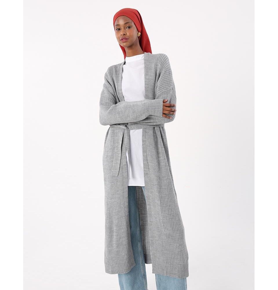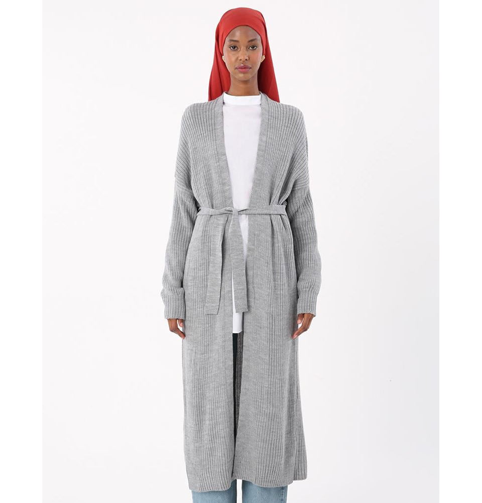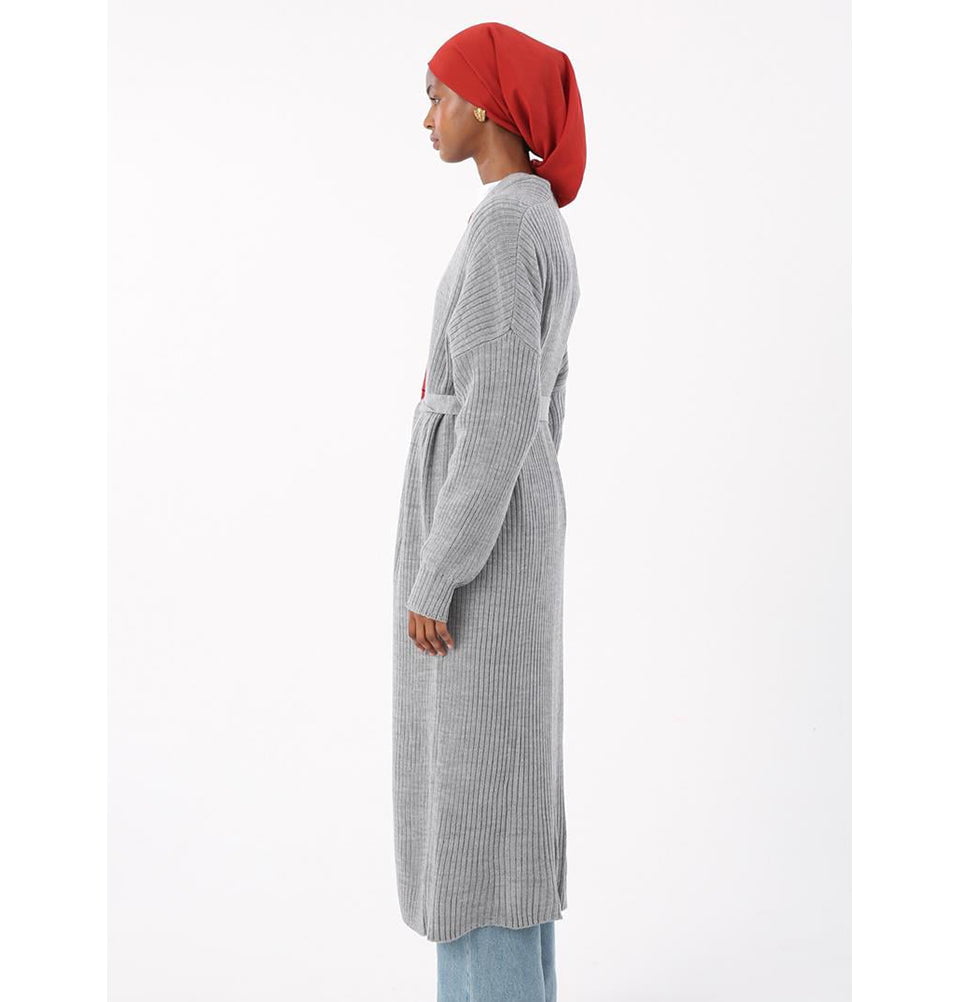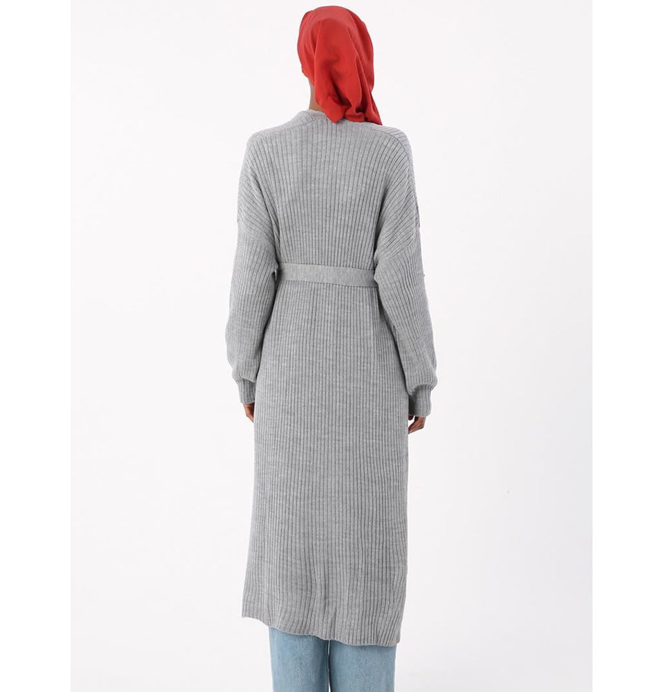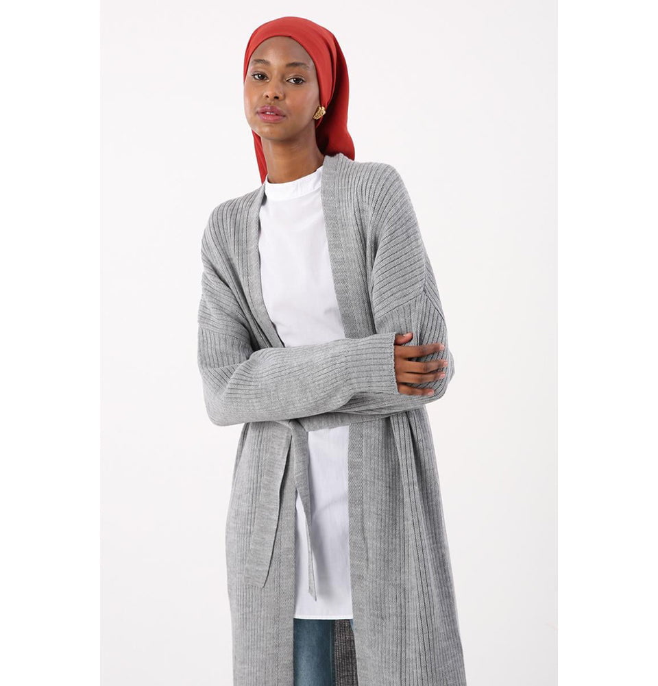 Modern Muslim Women's Belted Long Knitted Cardigan - Grey