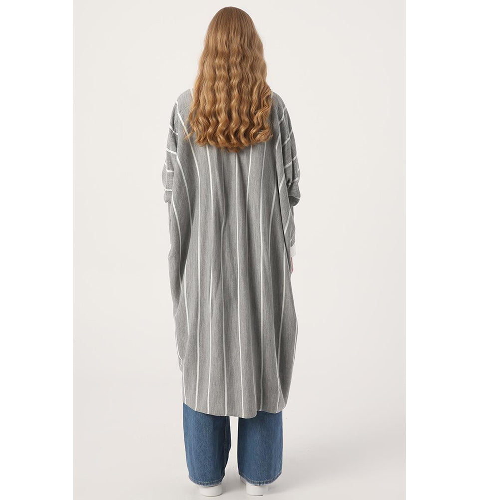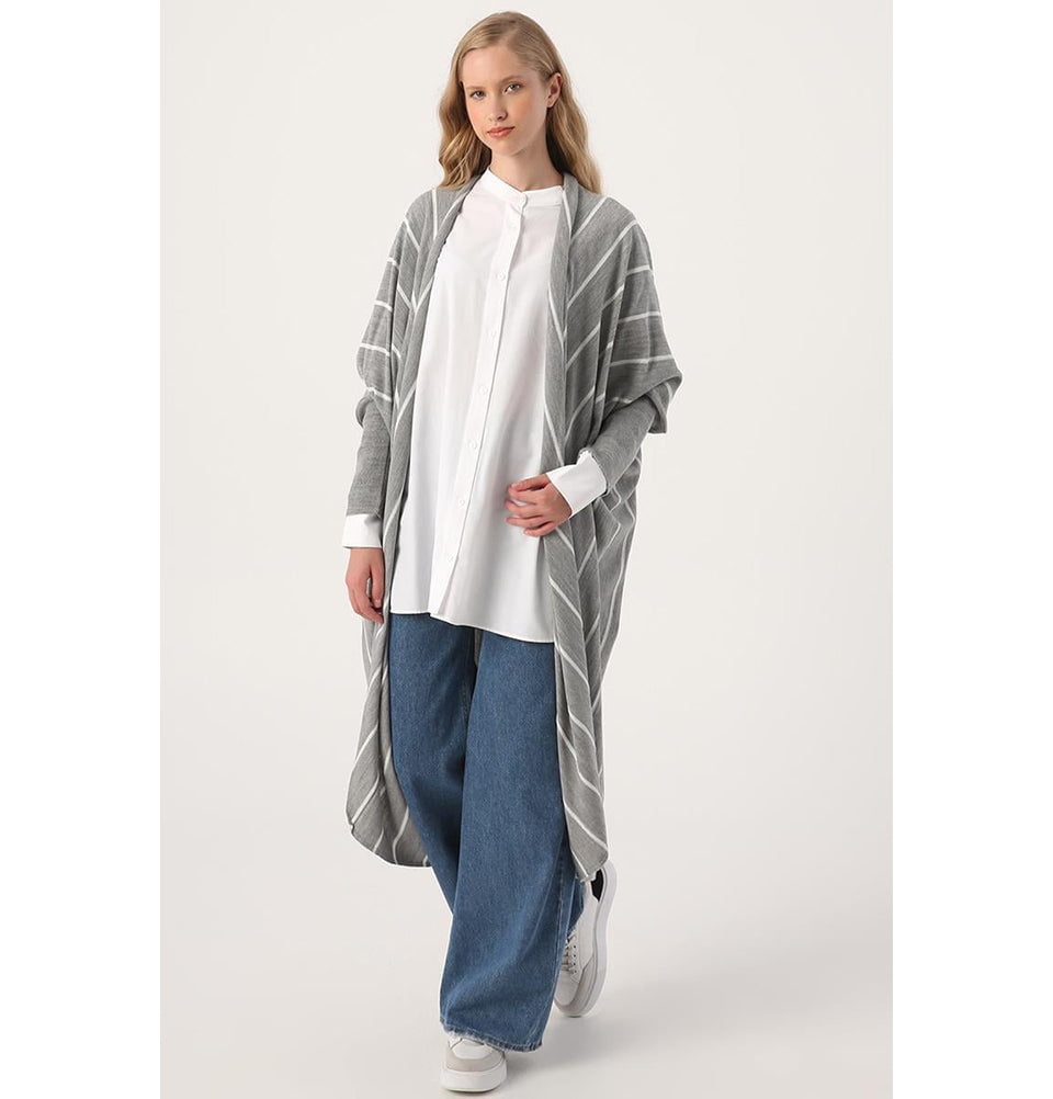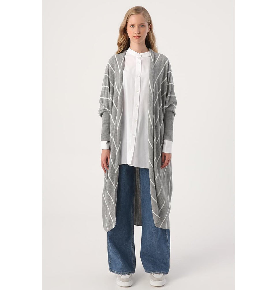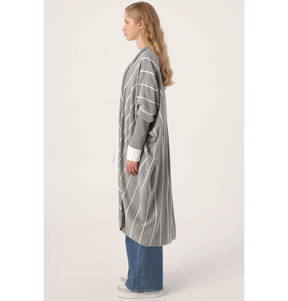 Modern Muslim Women's Striped Knitted Cardigan - 93087 Grey