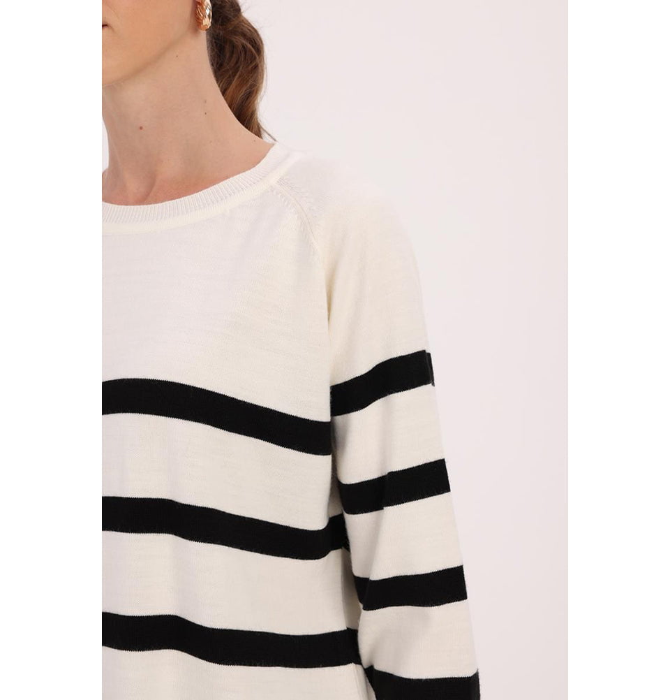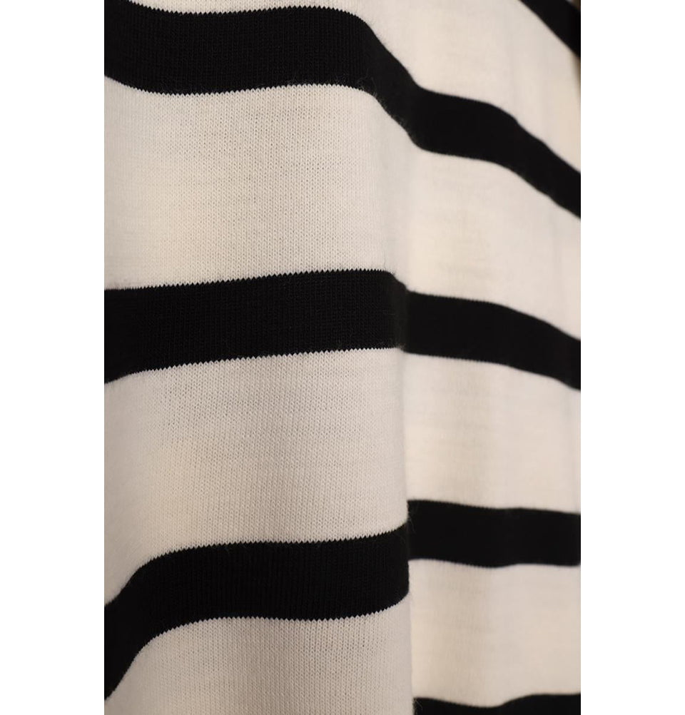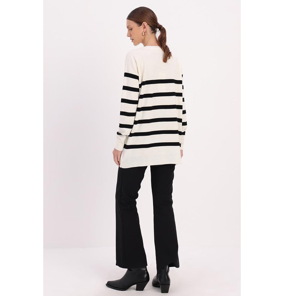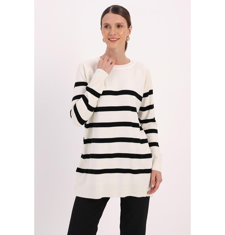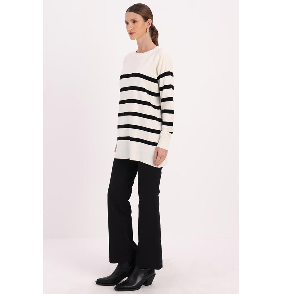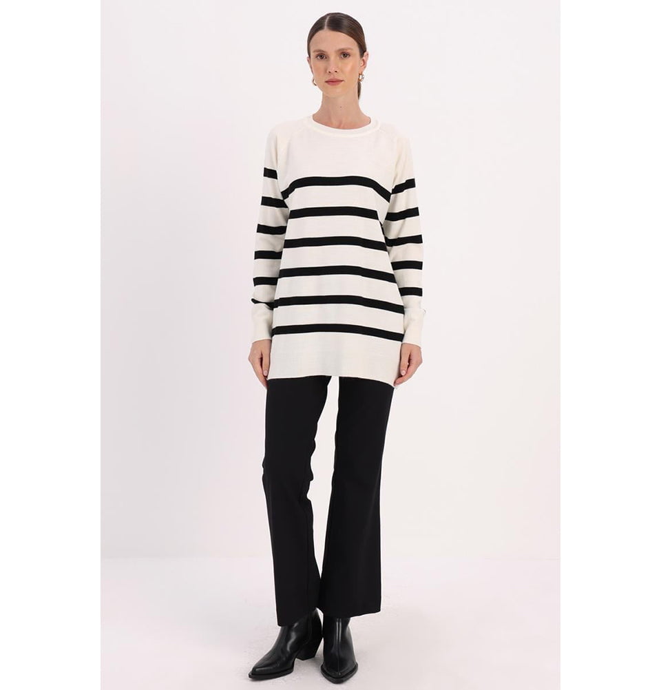 Modest Muslim Women's Basıc Striped Crew Neck Sweater - Black & Ecru