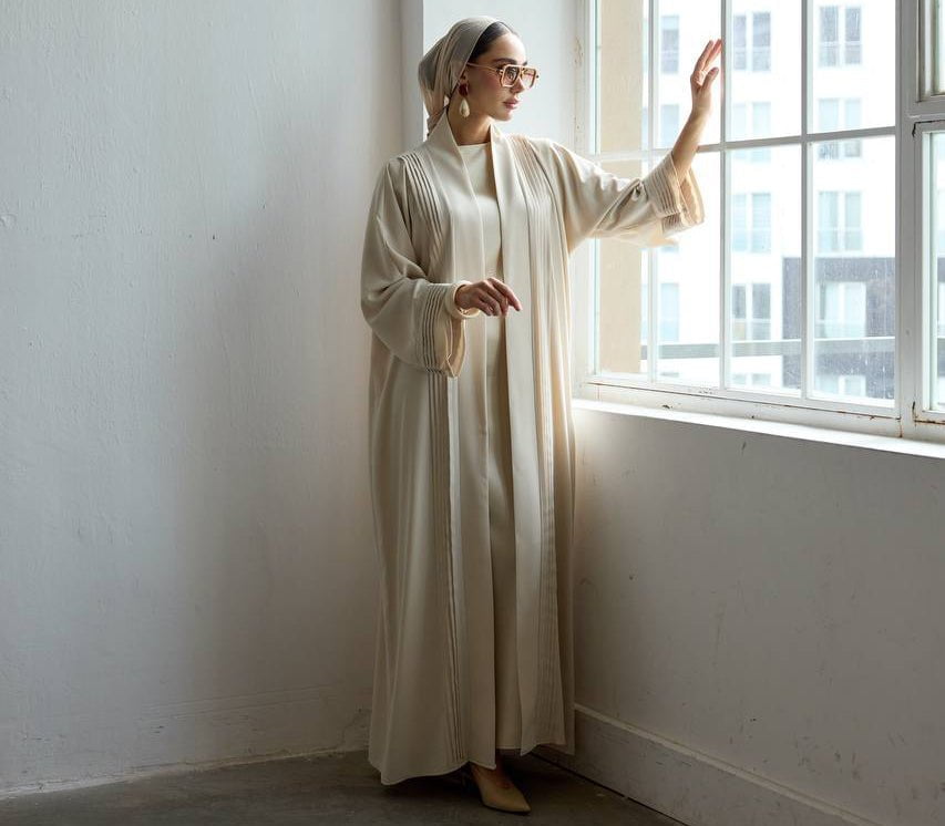 Understate elegance meets timeless modest duty in this classic chic beige abaya. Tailored with clean pleats and structured front paneling to create a sophisticated look. Uniquely designed for the modern Muslim woman who appreciates minimalism, this abaya is just the right fit. The abaya features subtle stitched pleats running vertically along the front and down the sleeves - showcasing texture, class and a flattering silhouette that's modest. The open front abaya can be worn with a casual outfit, as an overcoat or with one of our slip abayas. Ideal for both everyday wear or formal occasion, this beautiful abaya is effortlessly chic.