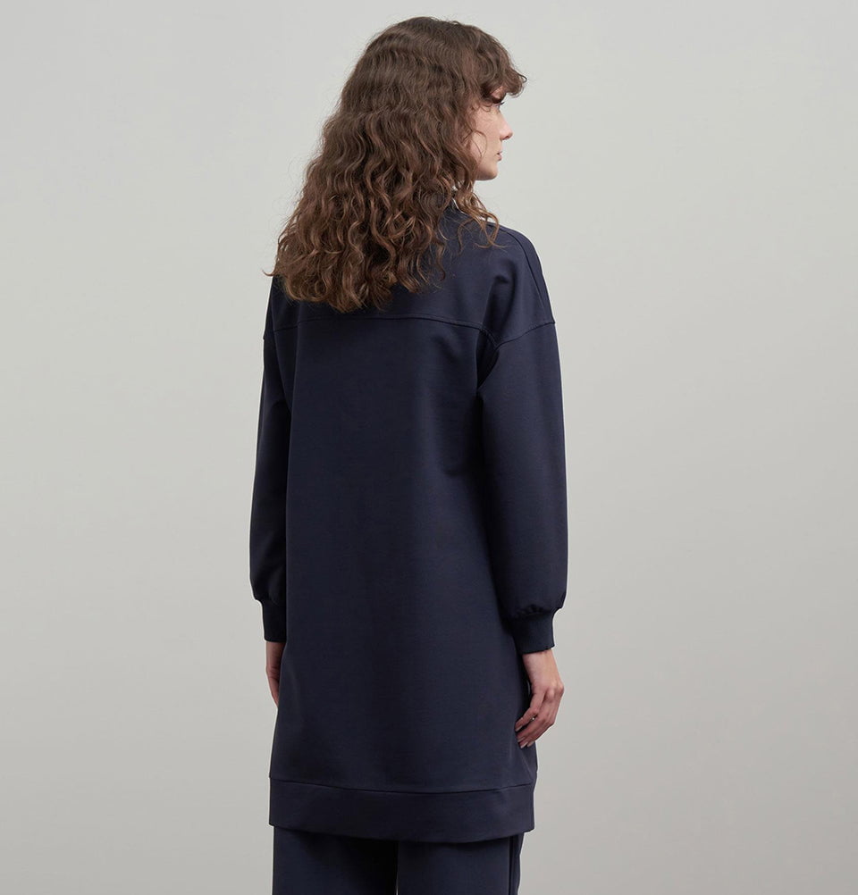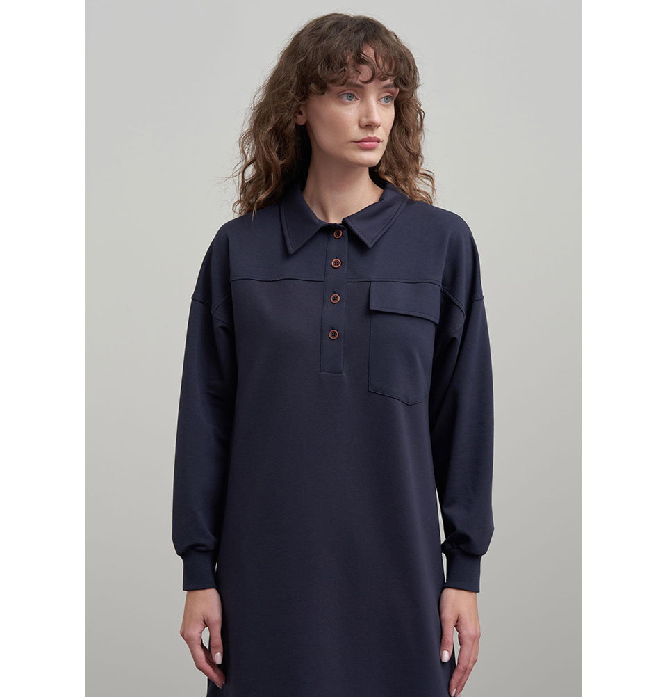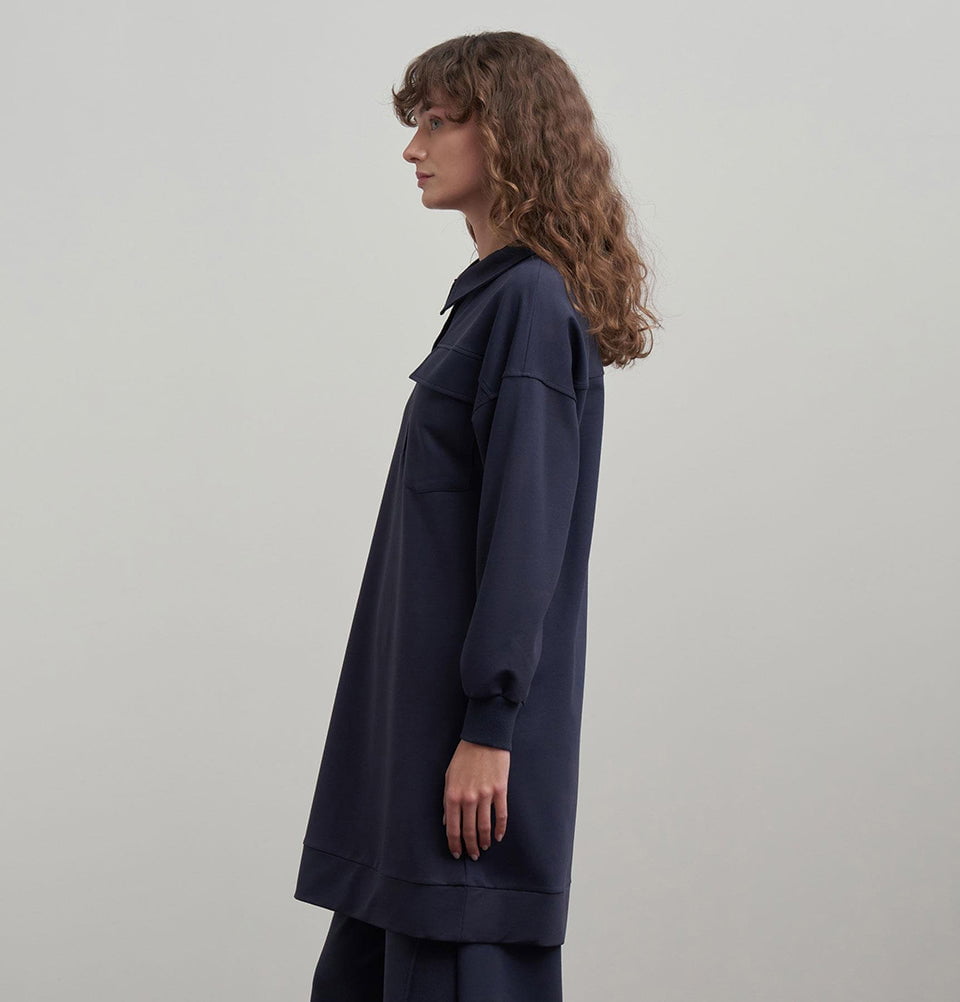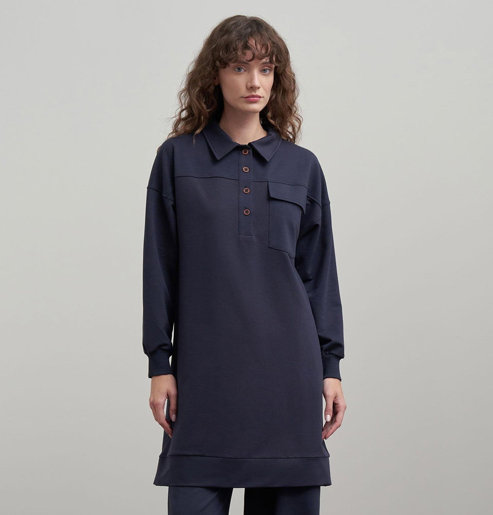 Refresh your casual wardrobe with this Cotton blend Tunic — a perfect fusion of comfort and understated contemporary style. Designed in a soft cotton-blend knit with relaxed, dropping shoulders and a laid-back silhouette, this tunic elevates everyday outfits with its minimalist charm. The classic shirt collar and subtle pocket detailing bring a refined edge to versatile modest layering looks.