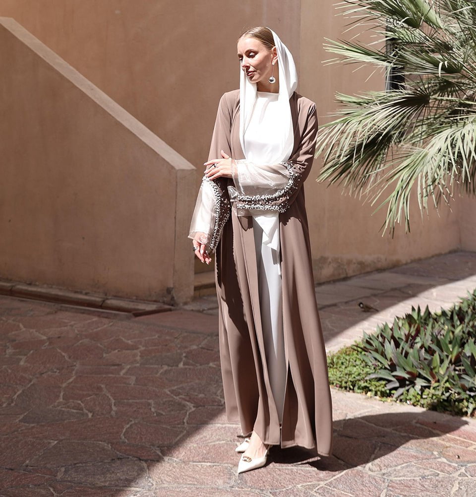 Muslim Women's Luxe Pearl Open Abaya - Mink