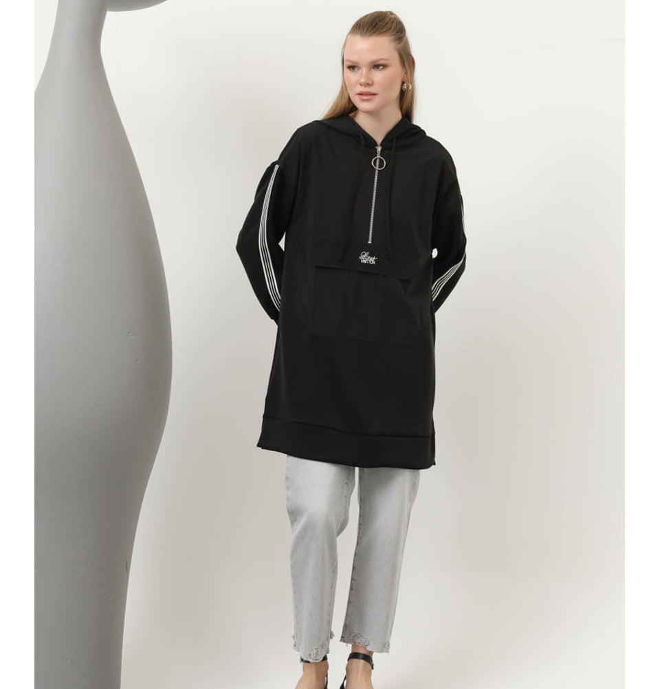 The longline design provides modest coverage, while sporty striped sleeve details and a functional half-zip closure add contemporary appeal. Lightweight yet substantial, this tunic is ideal for casual outings, travel, and everyday wear.