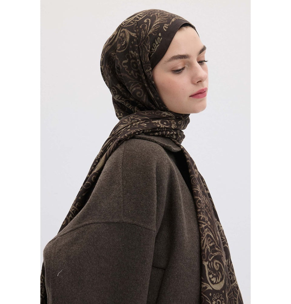 The combination of warm cocoa hues and delicate detailing gives this hijab a refined, timeless charm. It pairs seamlessly with neutral or tonal outfits, adding depth and texture without overwhelming your look. Its soft flow and structured hold make it easy to style, whether wrapped loosely or neatly pinned. Crafted from a comfortable, breathable material, this hijab provides a smooth, soft touch while maintaining its shape throughout the day. The fabric's gentle weight makes it ideal for year-round wear.