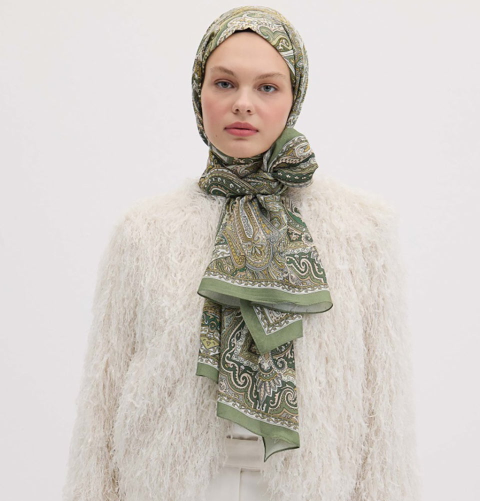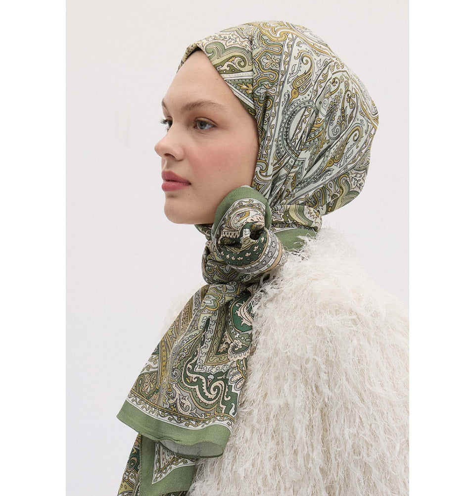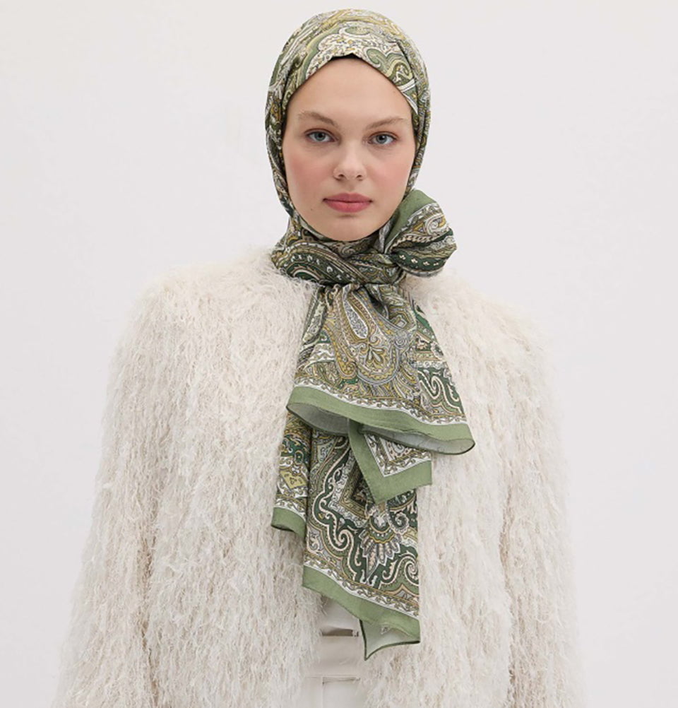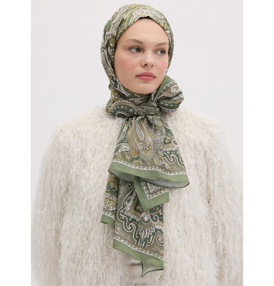 Modal Silk Blend Bohemian Breeze Etnic Floral Shawl Hijab - Moss Green