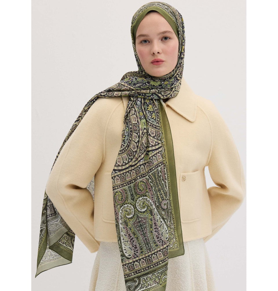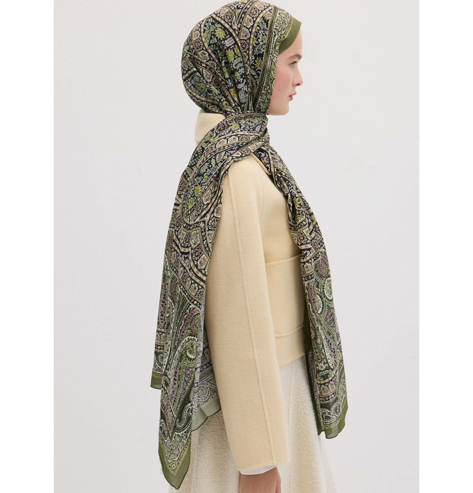 Immerse yourself in cozy and elegant style in this bohemian breeze collection. Embodied in timeless elegance with this richly toned hijab, showcasing painterly paisley floral details on a deep canvas. Crafted from a buttery-soft blend of silk, cotton, and modal, it drapes luxuriously while keeping its refined structure. It offers full versatility-whether styled as a modest hijab, chic neck wrap, or shoulder embrace. Easy to shape and slip-free, it's the perfect choice for long-lasting grace. It's lightweight, year-round friendly, and designed to hold its shape while resisting slipping during wear. Perfect hijab for the modest Muslim woman.