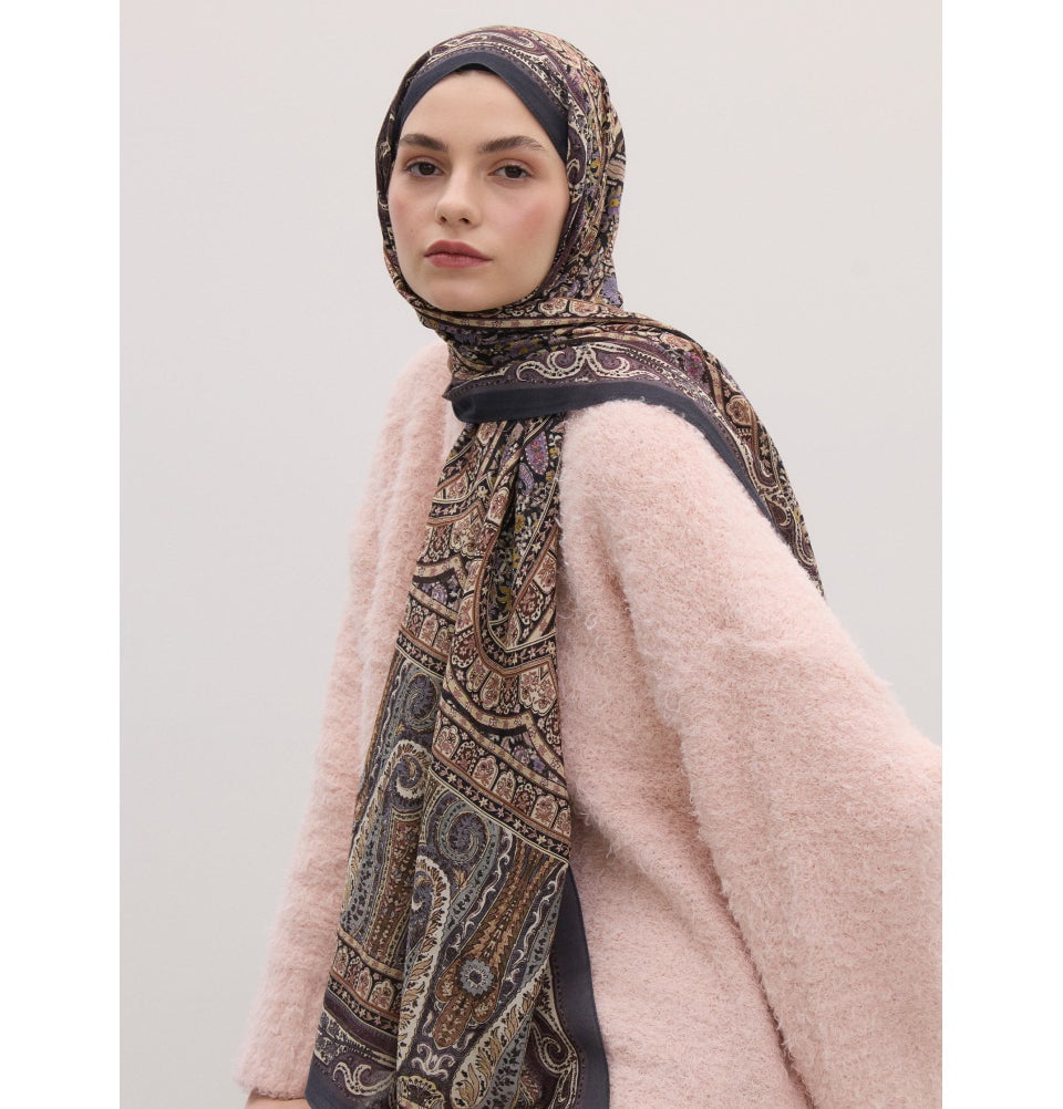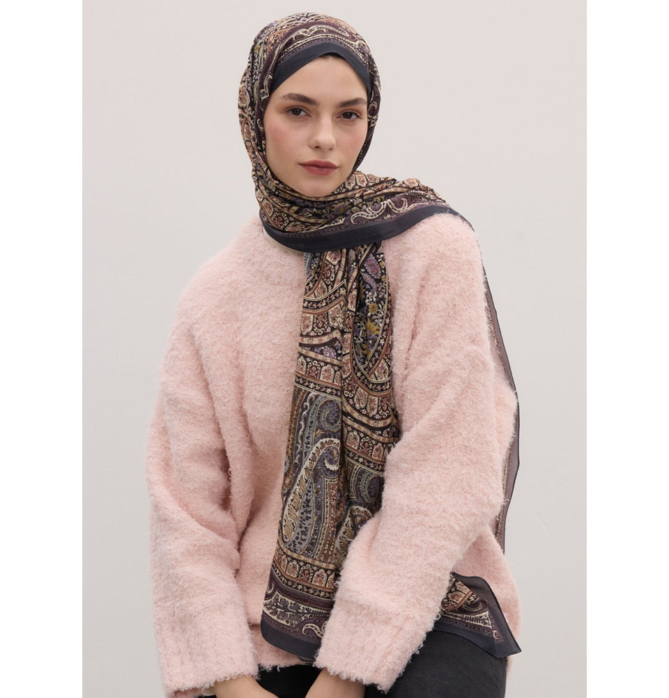 Immerse yourself in cozy and elegant style in this bohemian breeze collection. Embodied in timeless elegance with this richly toned hijab, showcasing painterly paisley floral details on a deep purple canvas. Crafted from a buttery-soft blend of silk, cotton, and modal, it drapes luxuriously while keeping its refined structure. It offers full versatility-whether styled as a modest hijab, chic neck wrap, or shoulder embrace. Easy to shape and slip-free, it's the perfect choice for long-lasting grace. It's lightweight, year-round friendly, and designed to hold its shape while resisting slipping during wear. Perfect hijab for the modest Muslim woman.
