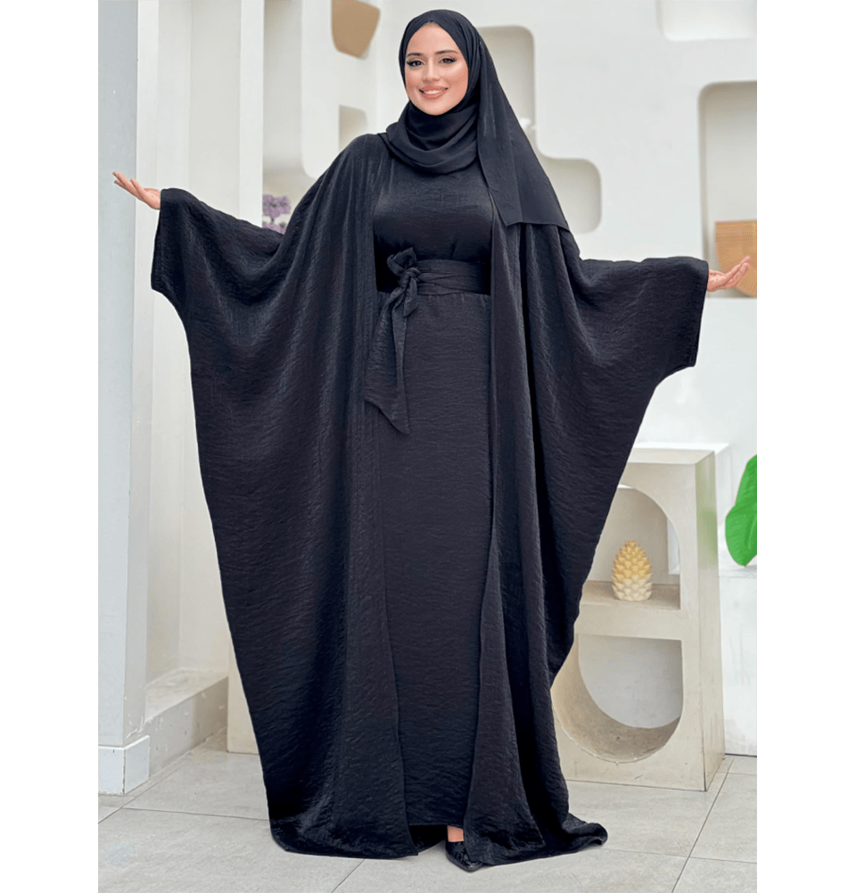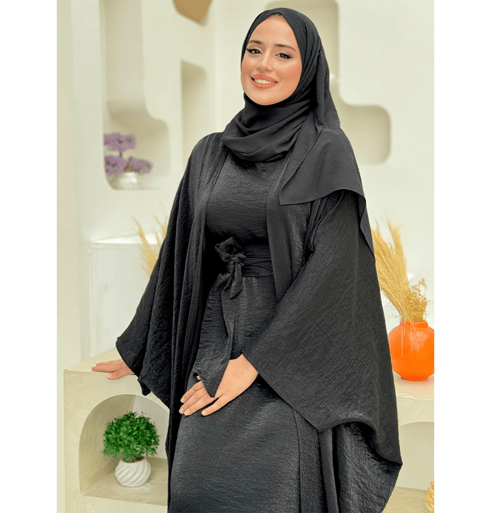 Modest Muslim Woman's Luxe Silk Kimono Two Piece Abaya - 8497 Black