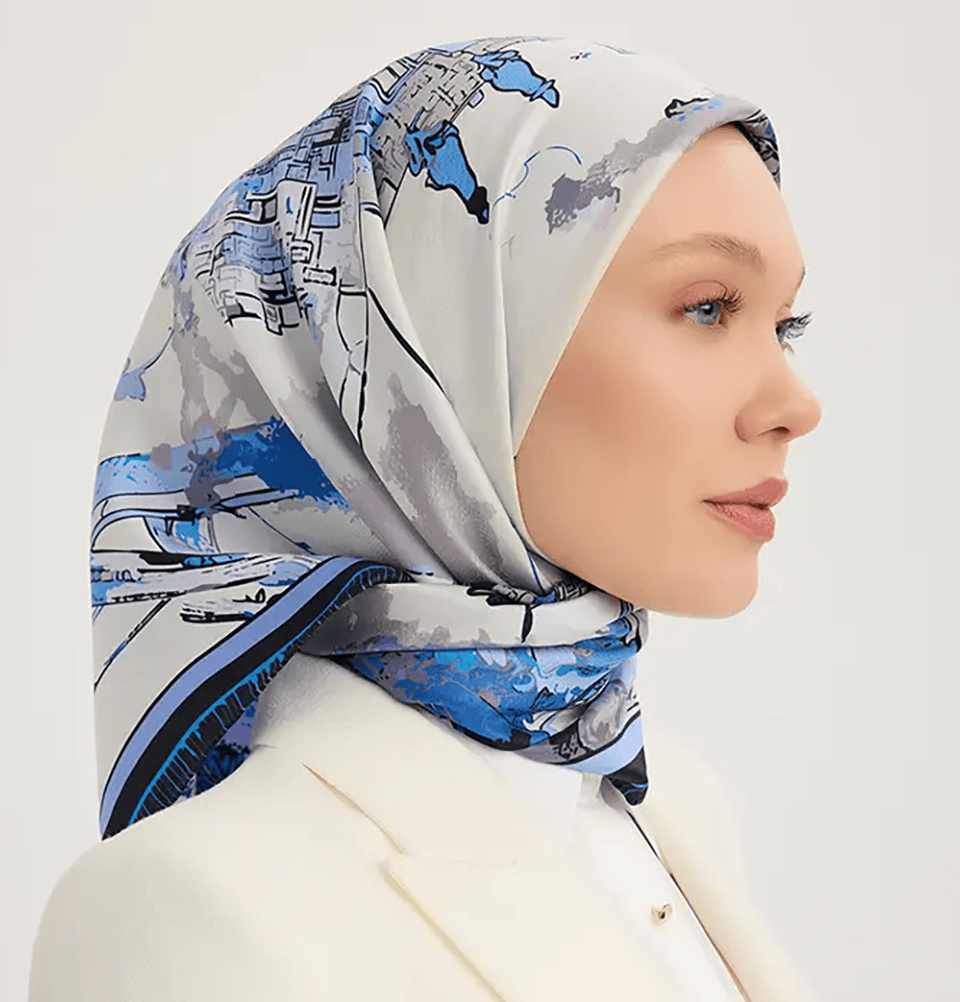 Serica Patterned Silk Square Crescent City Hijab - Indigo