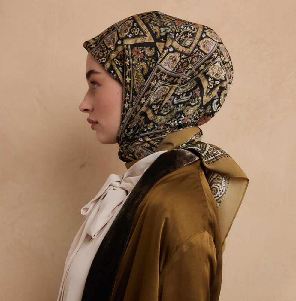 Immerse yourself in cozy elegance with this Nordic Paisley Patterned Scarf with a cool and warm hues-part of the exclusive Bohemian Breeze collection. The scarf showcases a refined Nordic floral motif, artfully arranged across a rich backdrop. The print weaves tradition with subtle artistry, embodying both understated charm and visual warmth. Made from a harmonious blend of 20% silk, 40% cotton, and 40% modal, this scarf offers a silky cotton texture that is both luxuriously soft and breathable. It's lightweight, year-round friendly, and designed to hold its shape while resisting slipping during wear.
