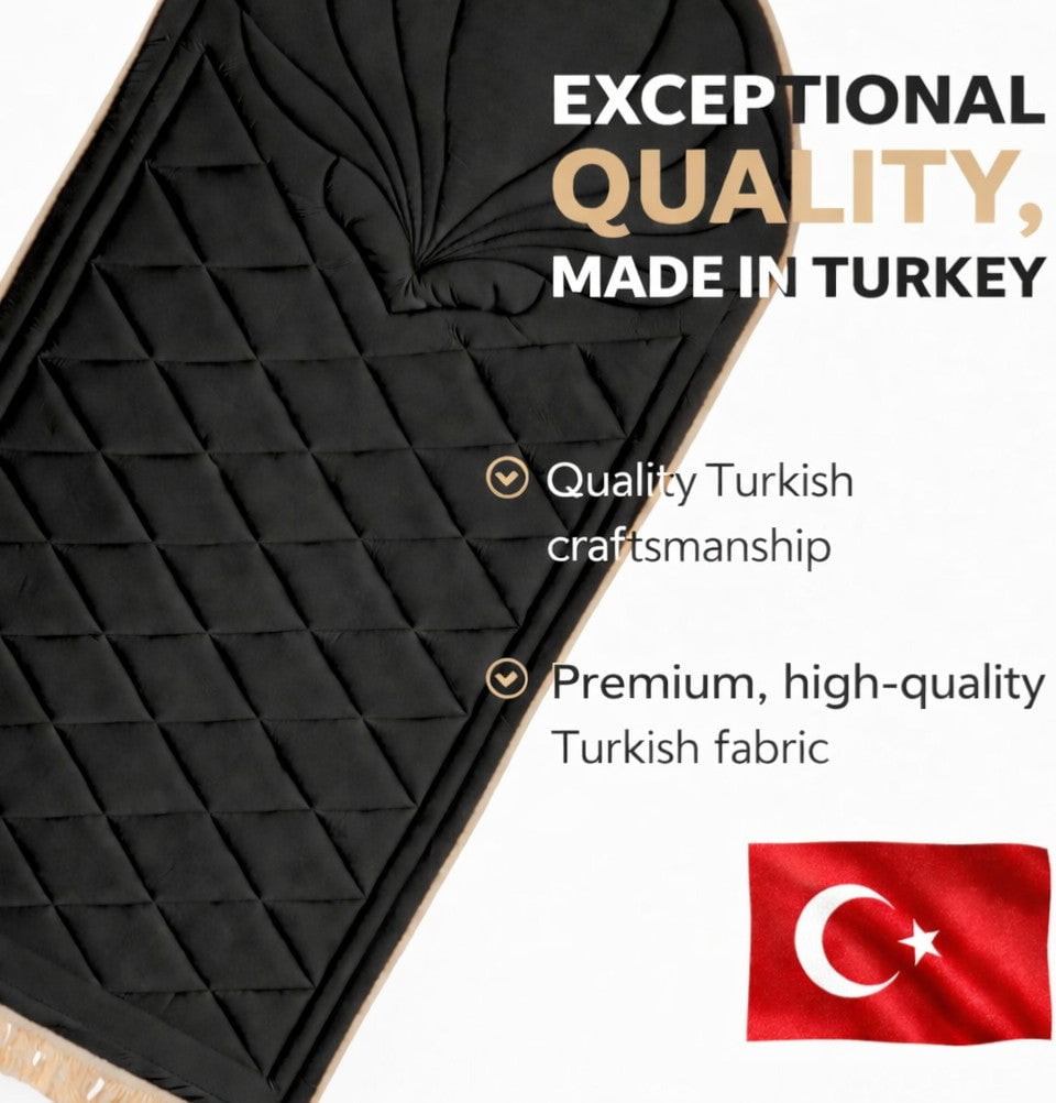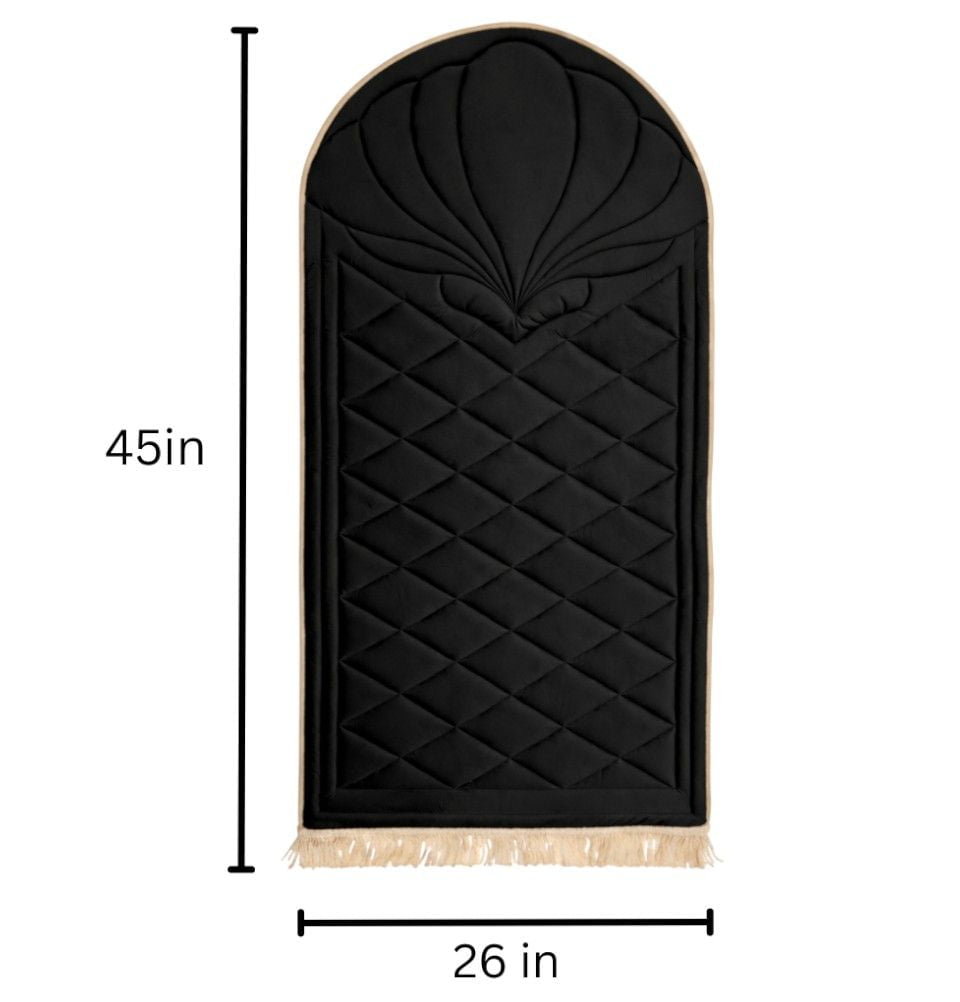 The Safaa prayer rug is crafted with a soft velvet top layer and a durable foam interior for reliable, long-lasting use. Finished with clean stitching and thoughtful construction, it is made to withstand regular folding and daily prayer while maintaining its shape and comfort.