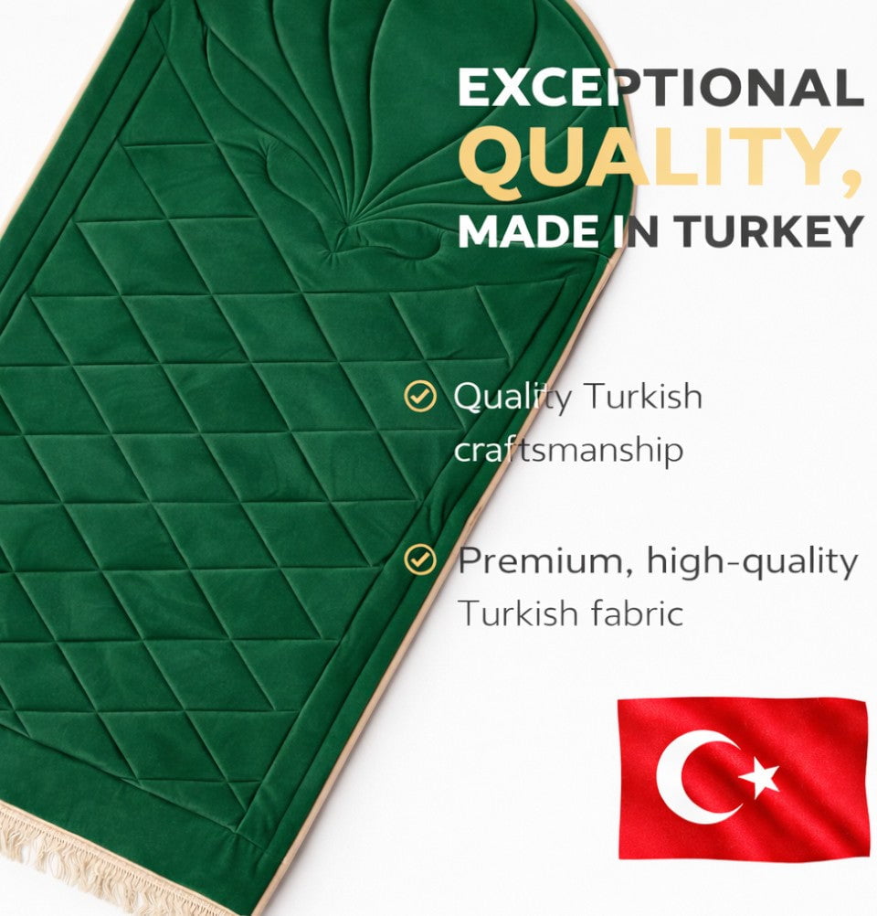 The Safaa prayer rug is crafted with a soft velvet top layer and a durable foam interior for reliable, long-lasting use. Finished with clean stitching and thoughtful construction, it is made to withstand regular folding and daily prayer while maintaining its shape and comfort.